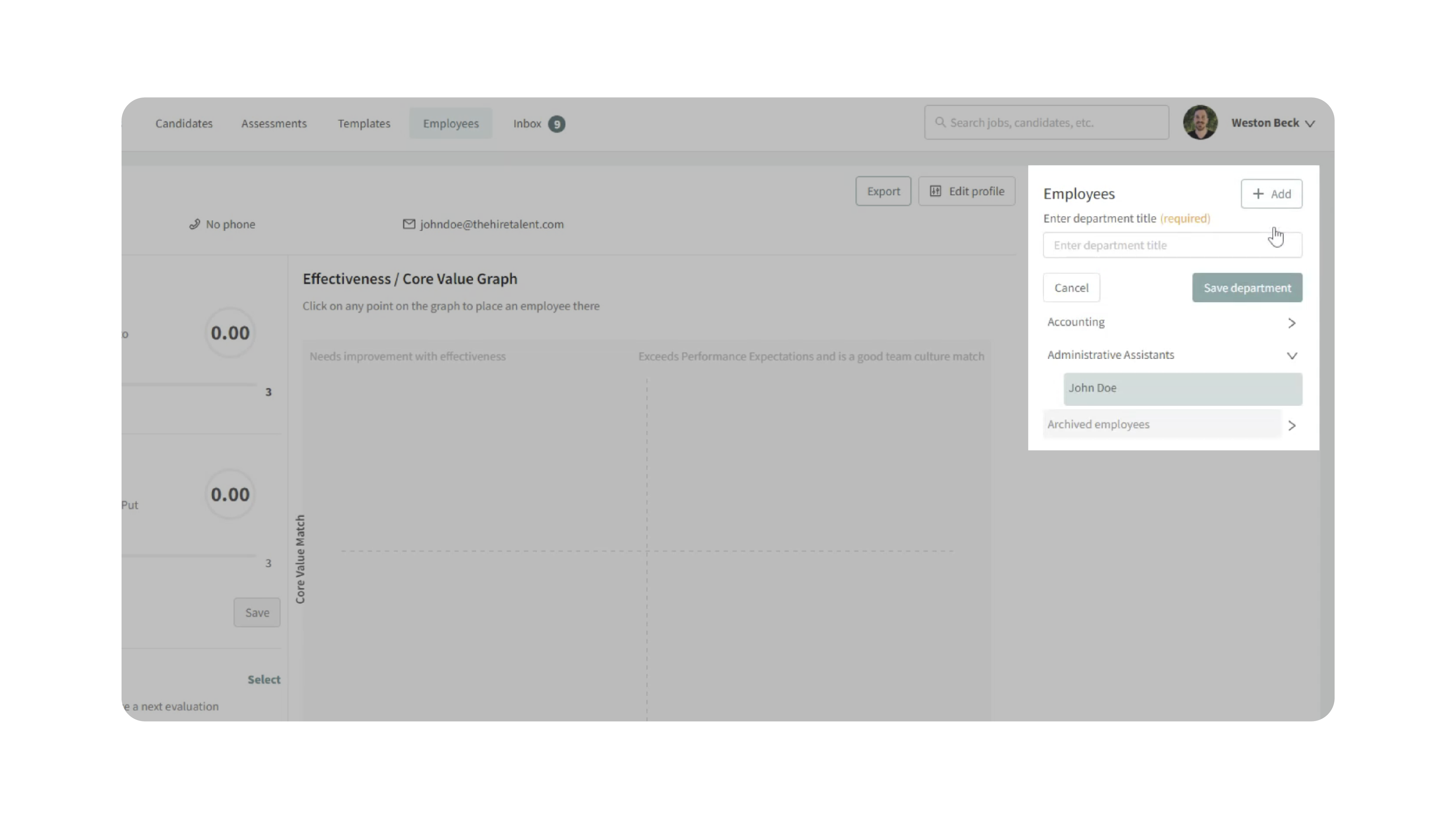 The Employee Talent Grader in Discovered allows you to easily add new hires, existing staff, or entire departments to your organization chart. You can place employees directly on the performance grid, assign them to departments, or automatically convert hired candidates into employees from job postings.