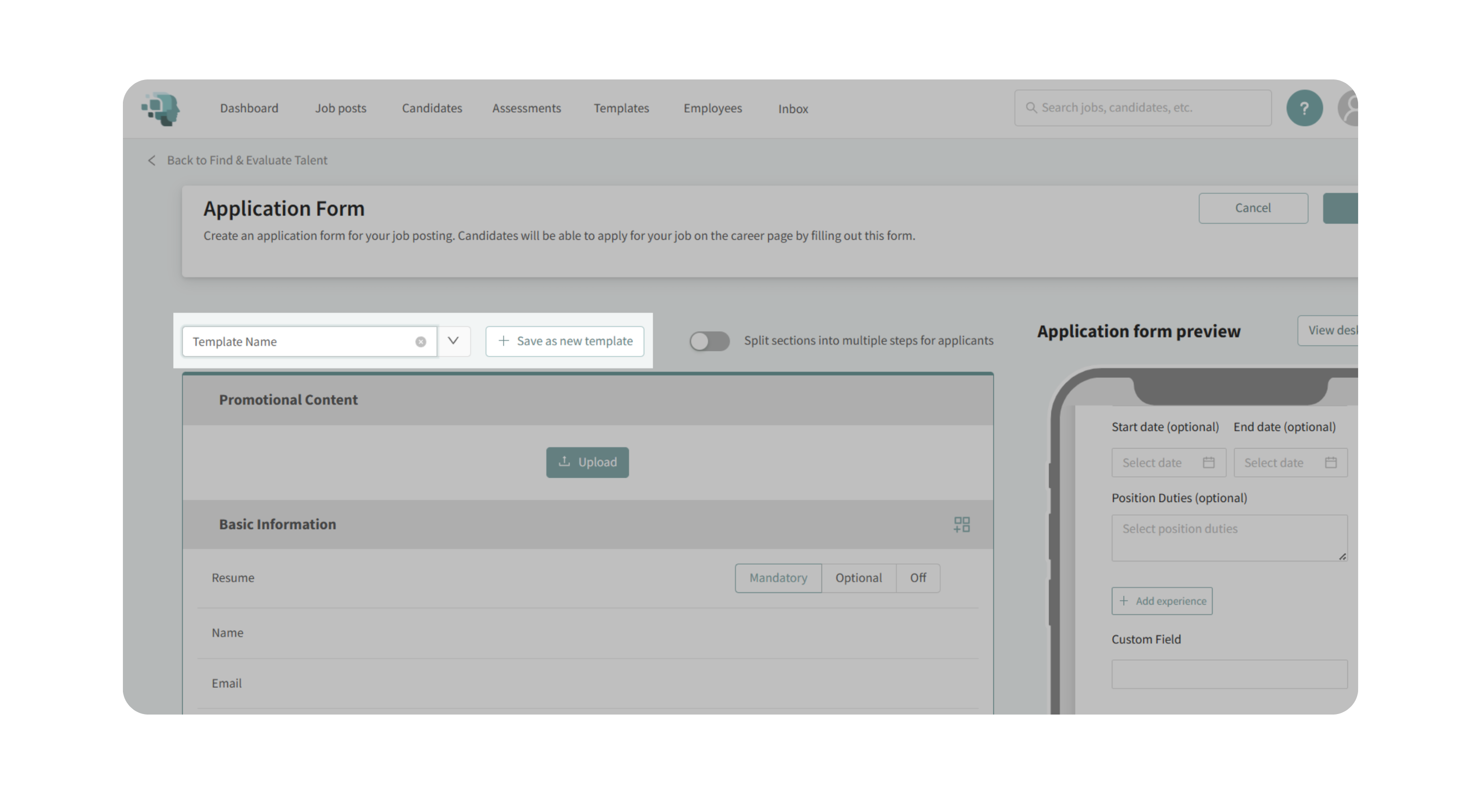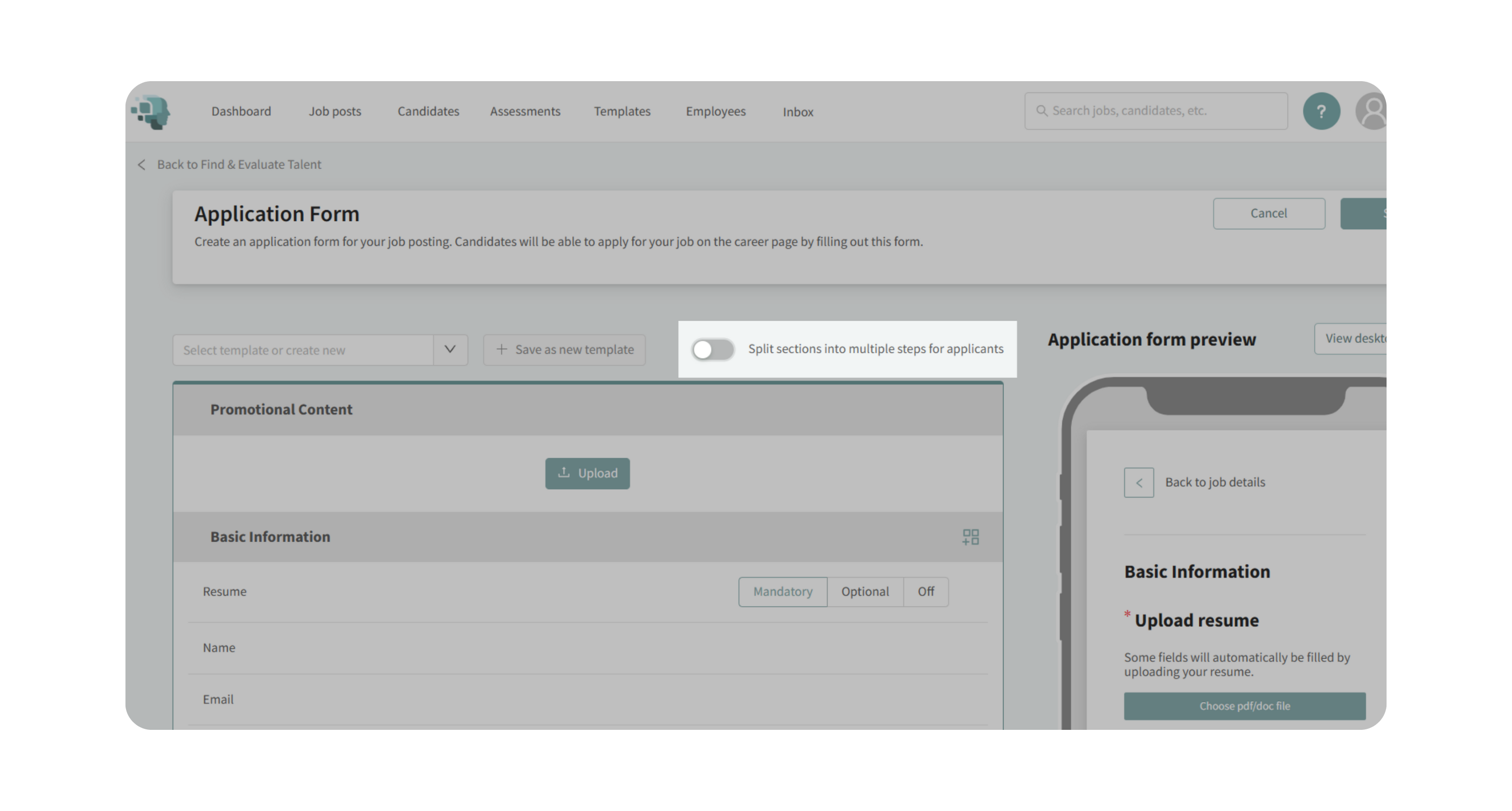 - Toggle Split Sections into Multiple Steps for Applicants.