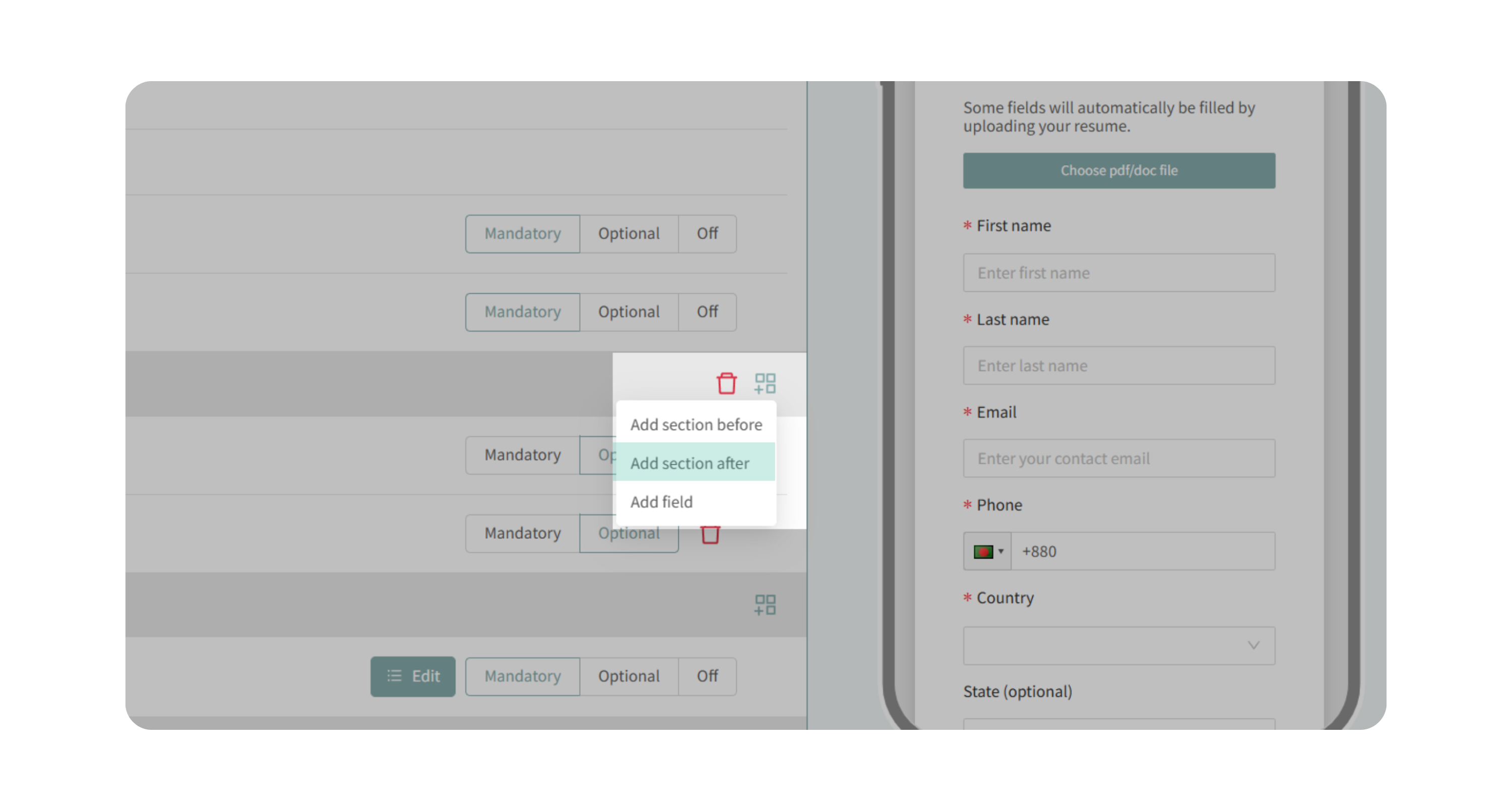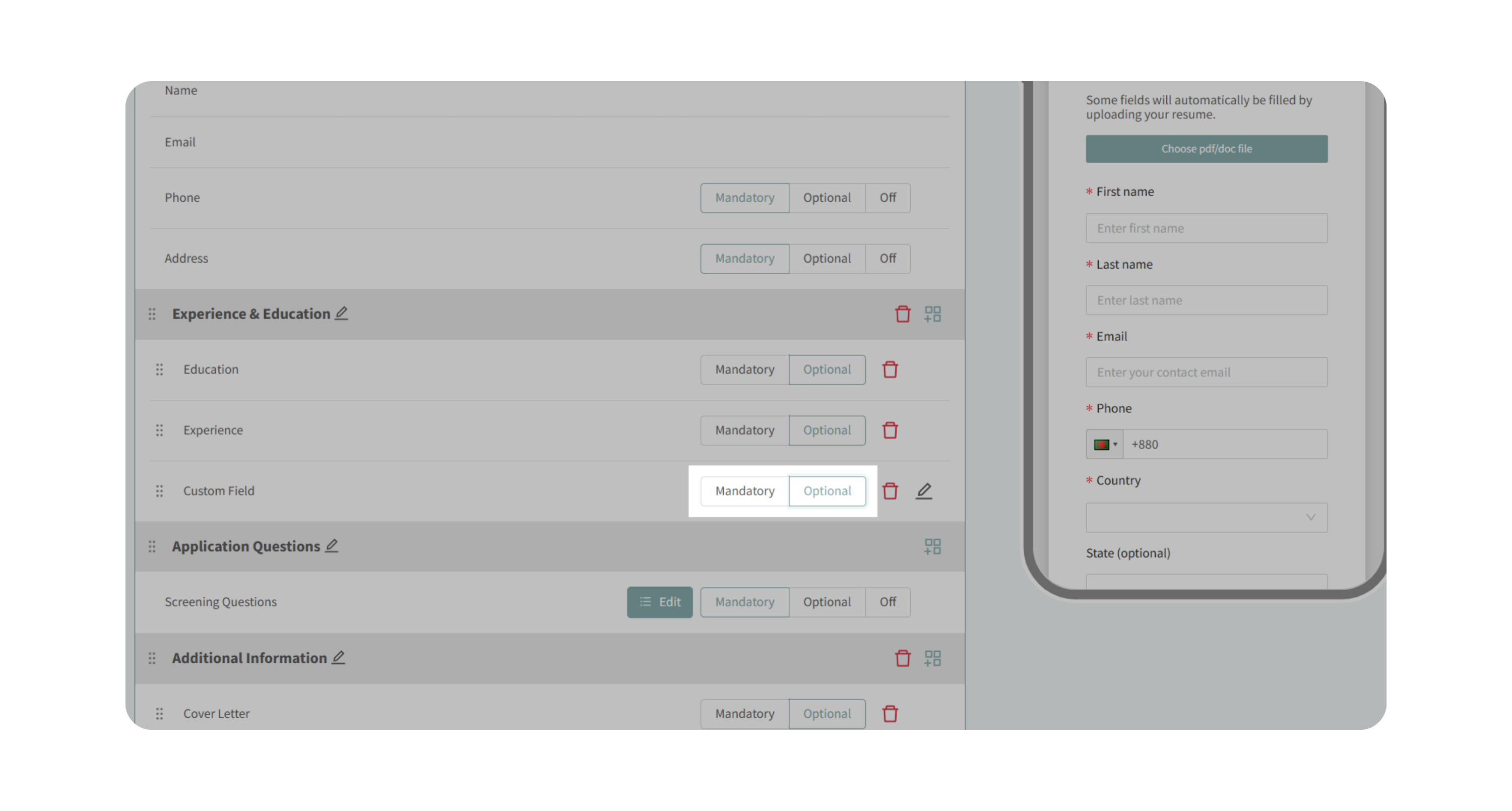 - Set each field as Optional or Mandatory (except Name and Email, which are always required).