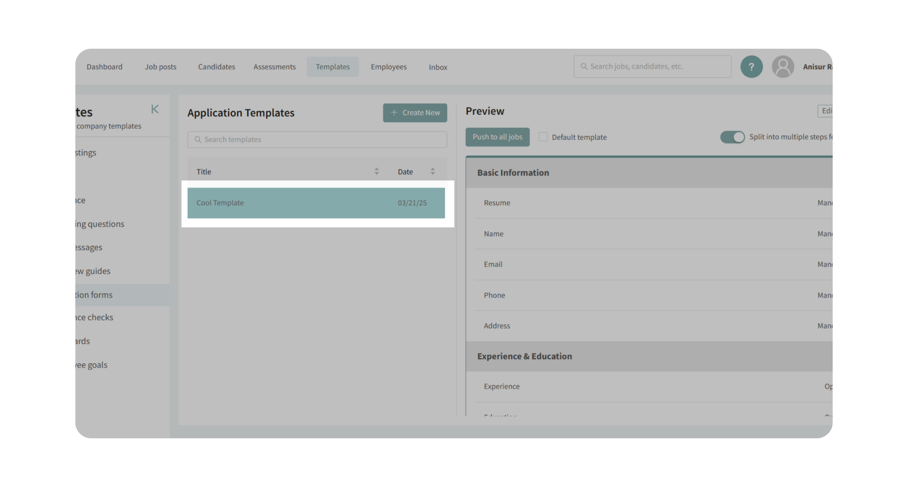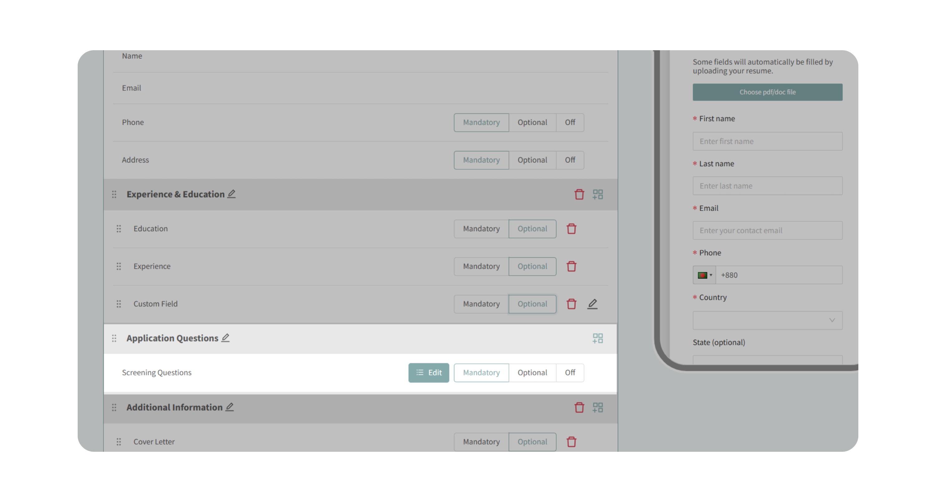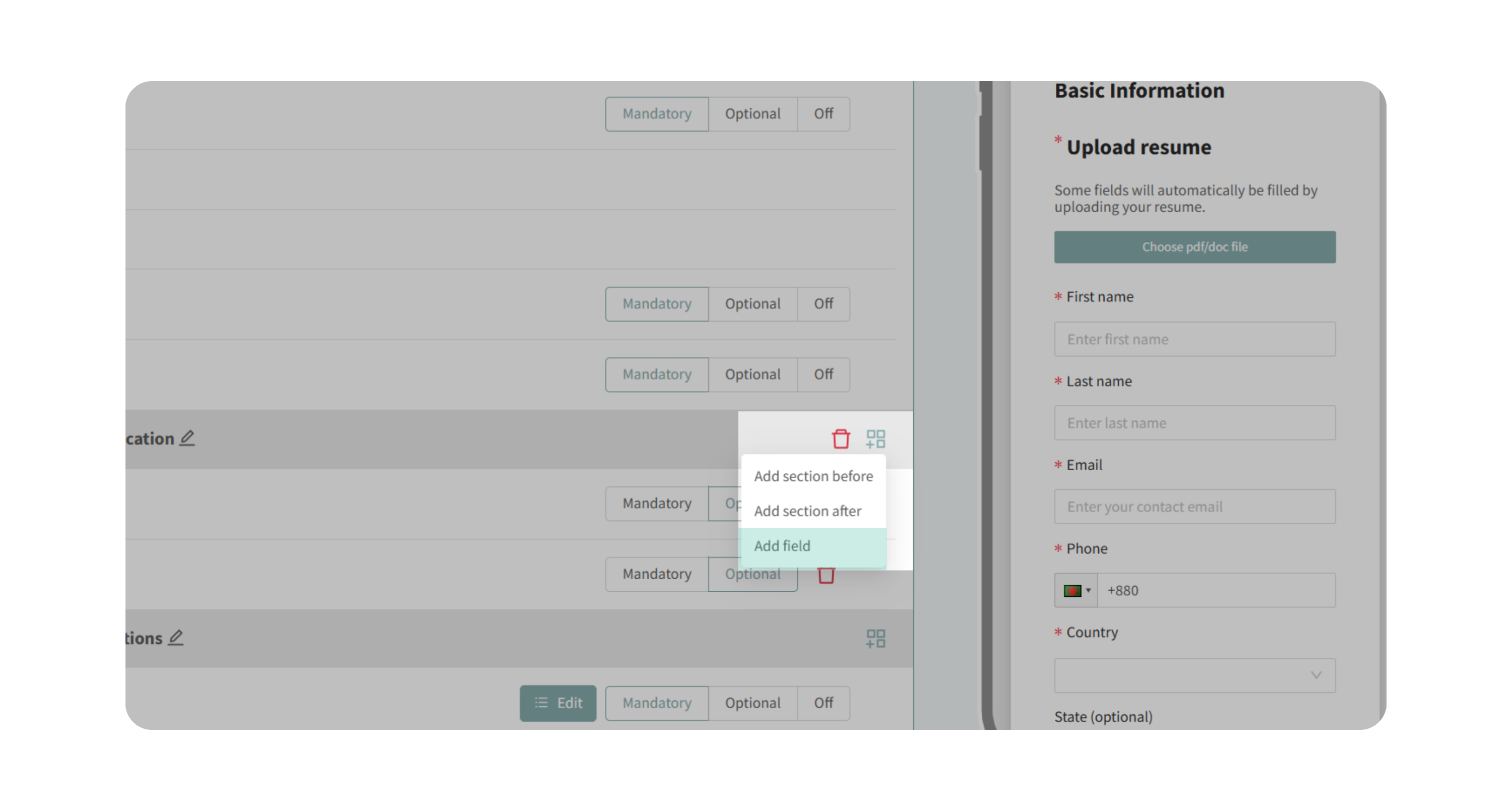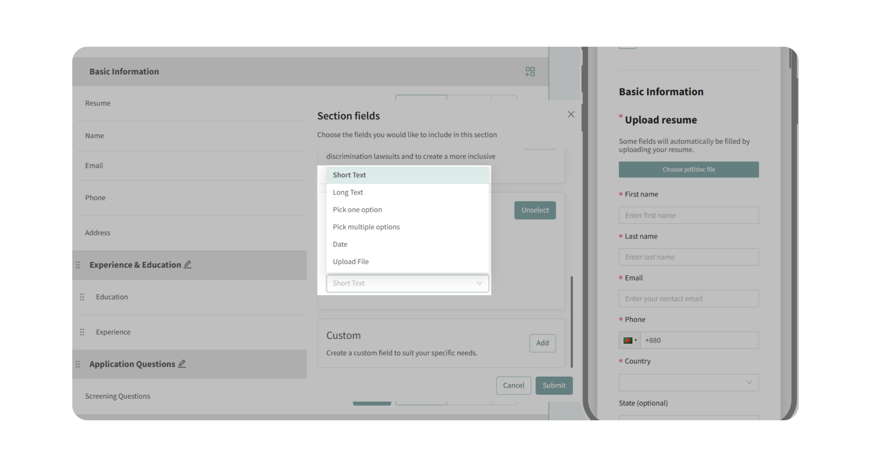 - Choose from boilerplate fields like Education, Experience, Cover Letter, Portfolio Link, or Demographic Information.