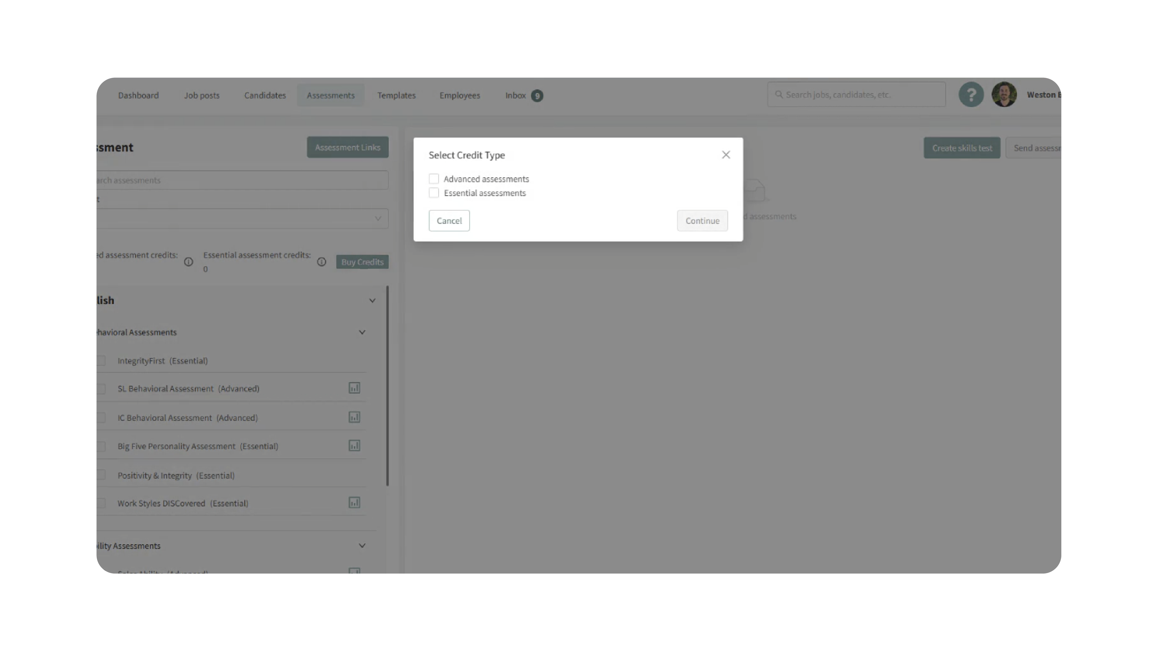 If your company is not subscribed to Discovered Unlimited, you’ll need to use assessment credits to send assessments to candidates. Each assessment type requires a specific credit type — Essential Credits for Essential Assessments and Advanced Credits for Advanced Assessments.