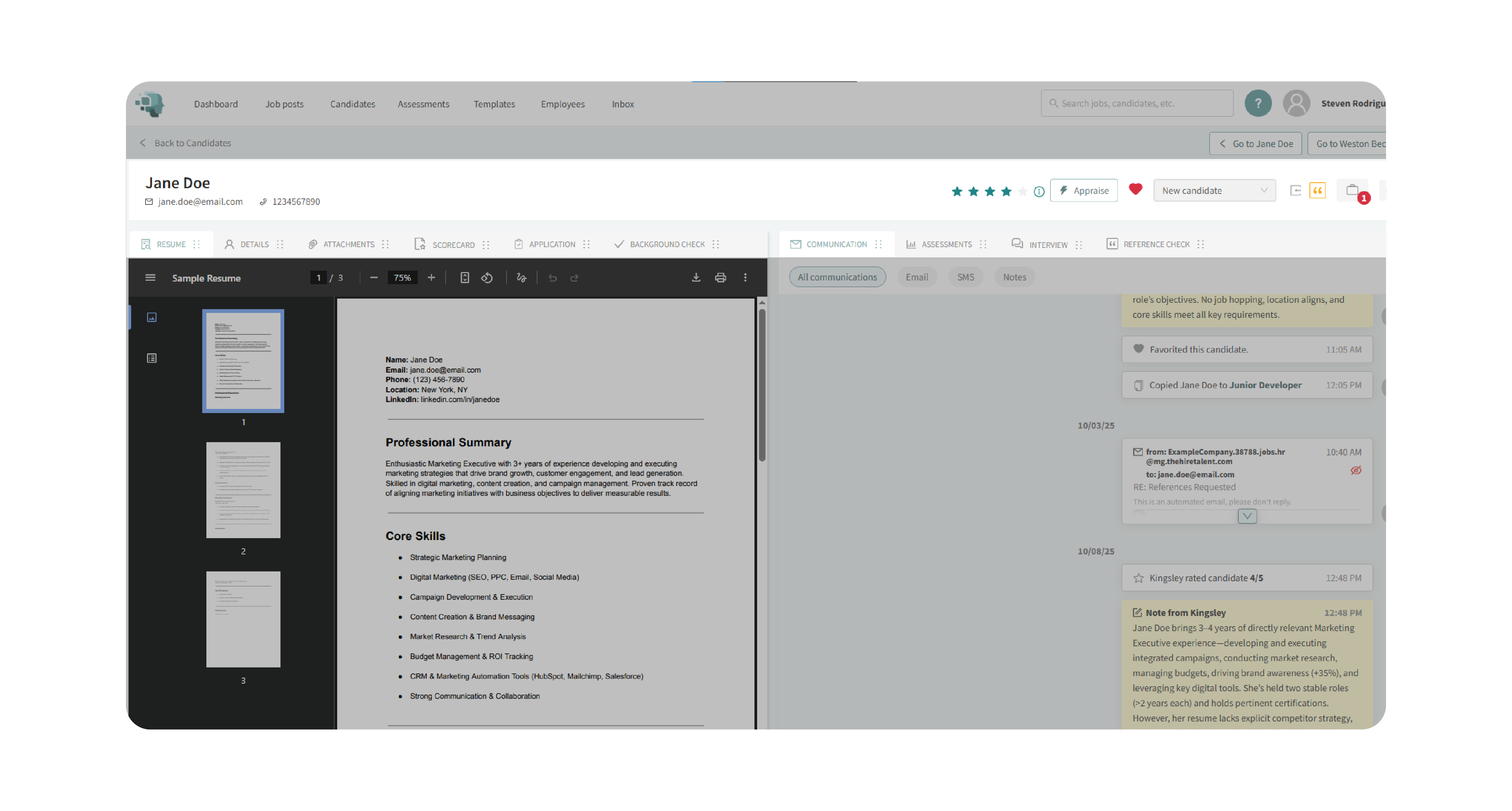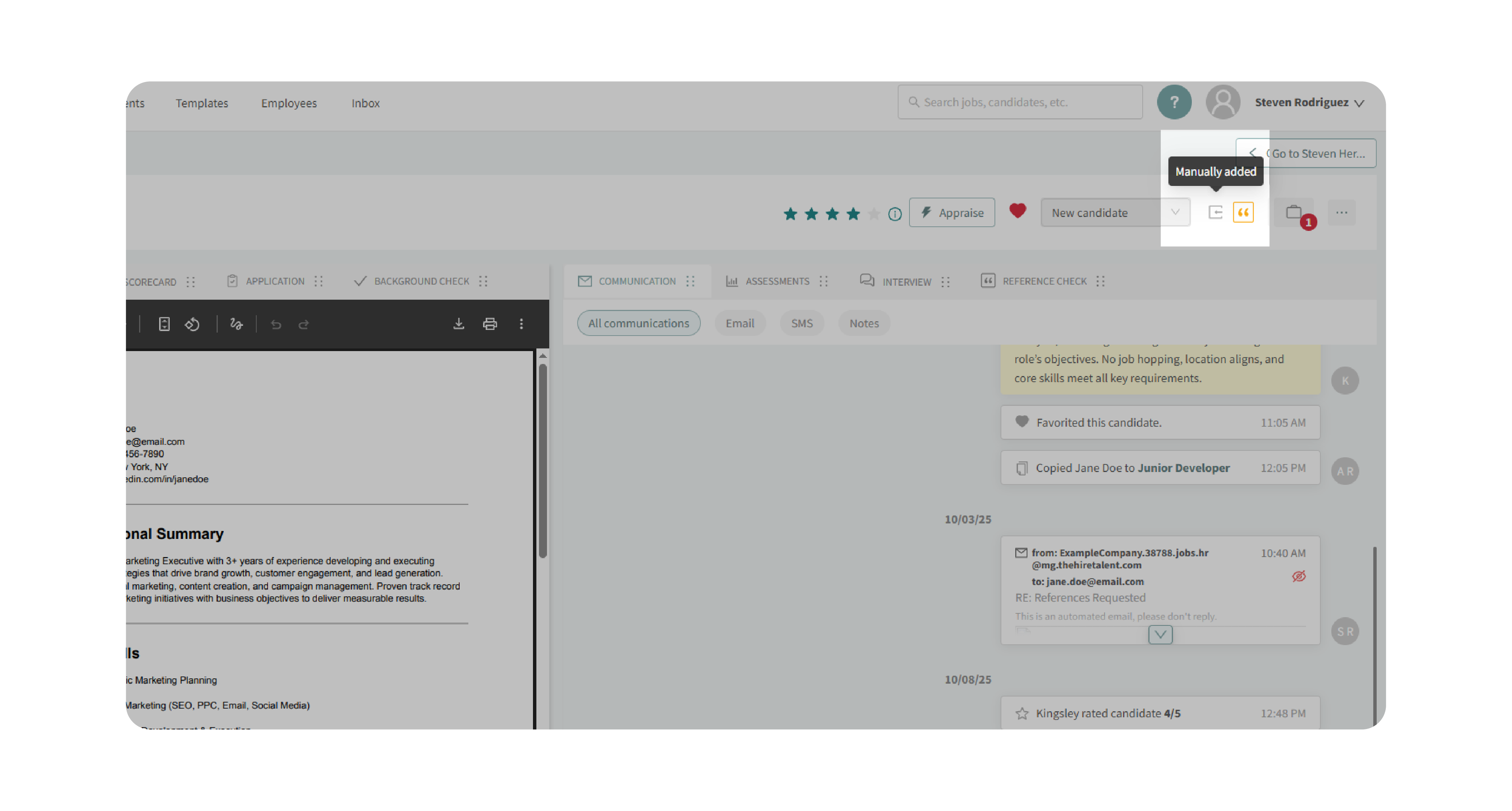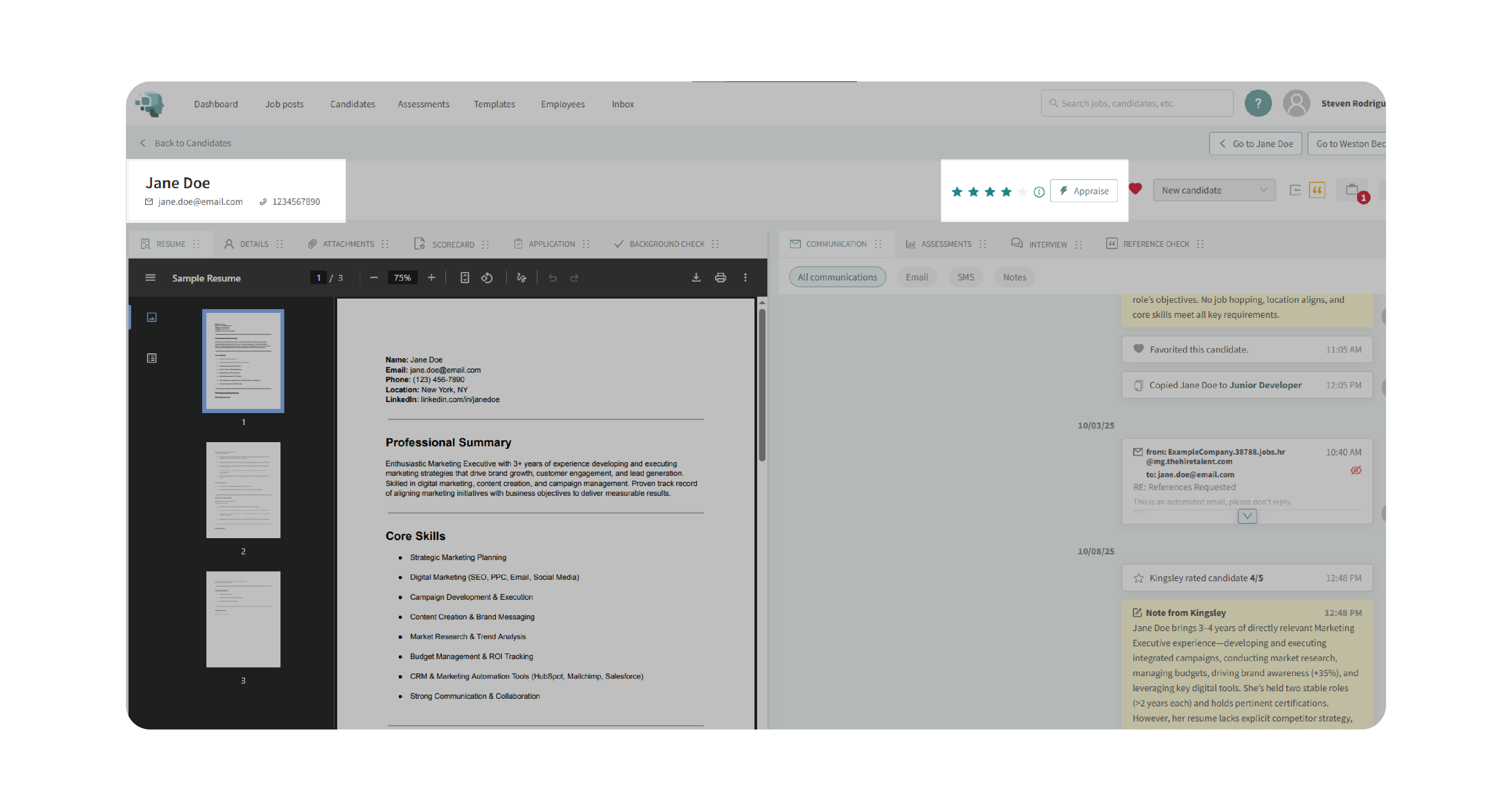 The Candidate Profile Header provides a feature-packed toolbar at the top of every candidate’s profile. It centralizes the most important information—such as name, contact details, star rating, status, and source—while also offering quick actions to streamline your workflow. From here, you can manually update ratings, use Kingsley AI to auto-appraise candidates, monitor task progress, and manage advanced options like exporting data, moving candidates between jobs, or converting them to employees.