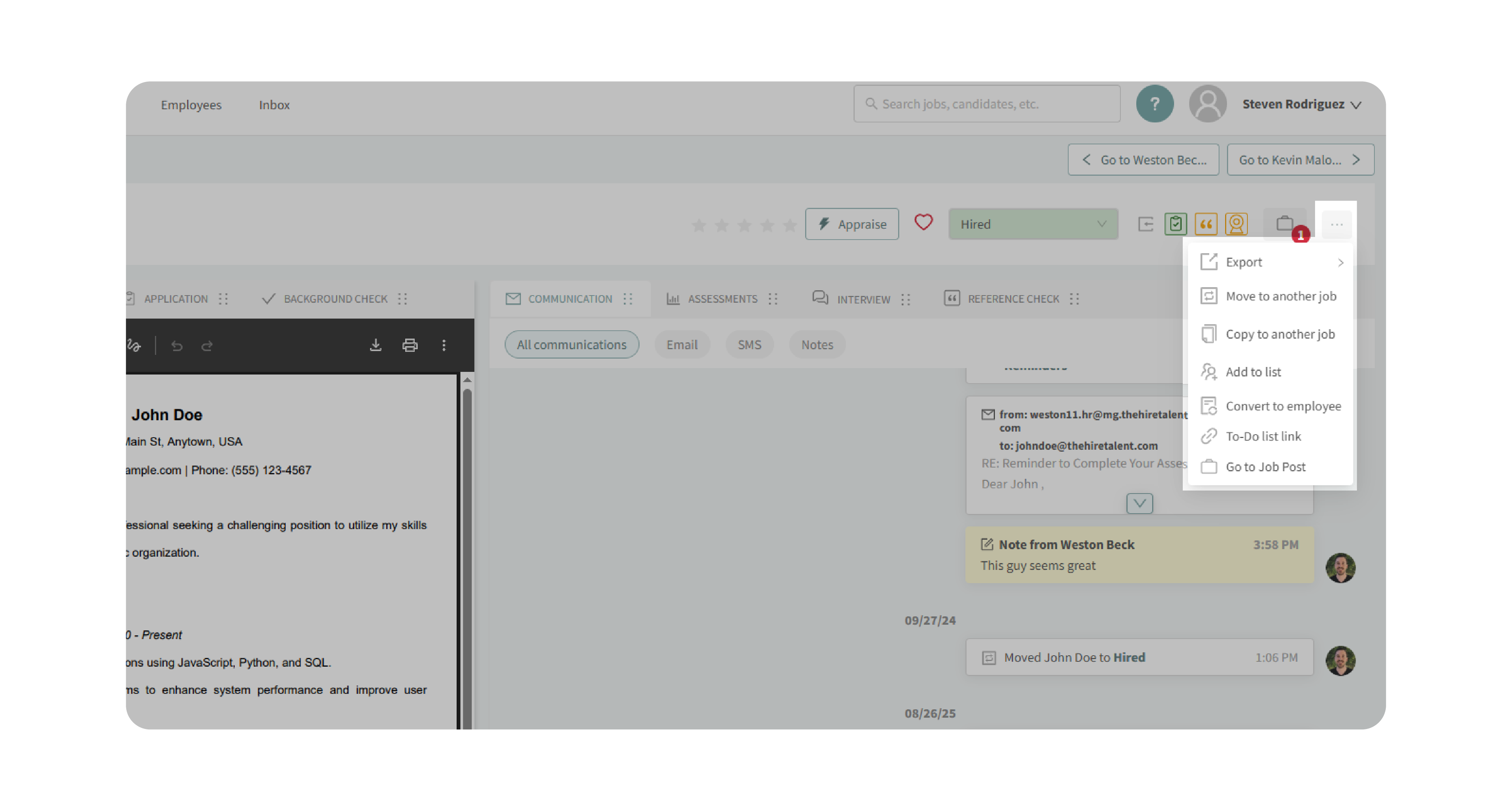 - Use the dropdown menu to update the candidate’s current status in the hiring process.