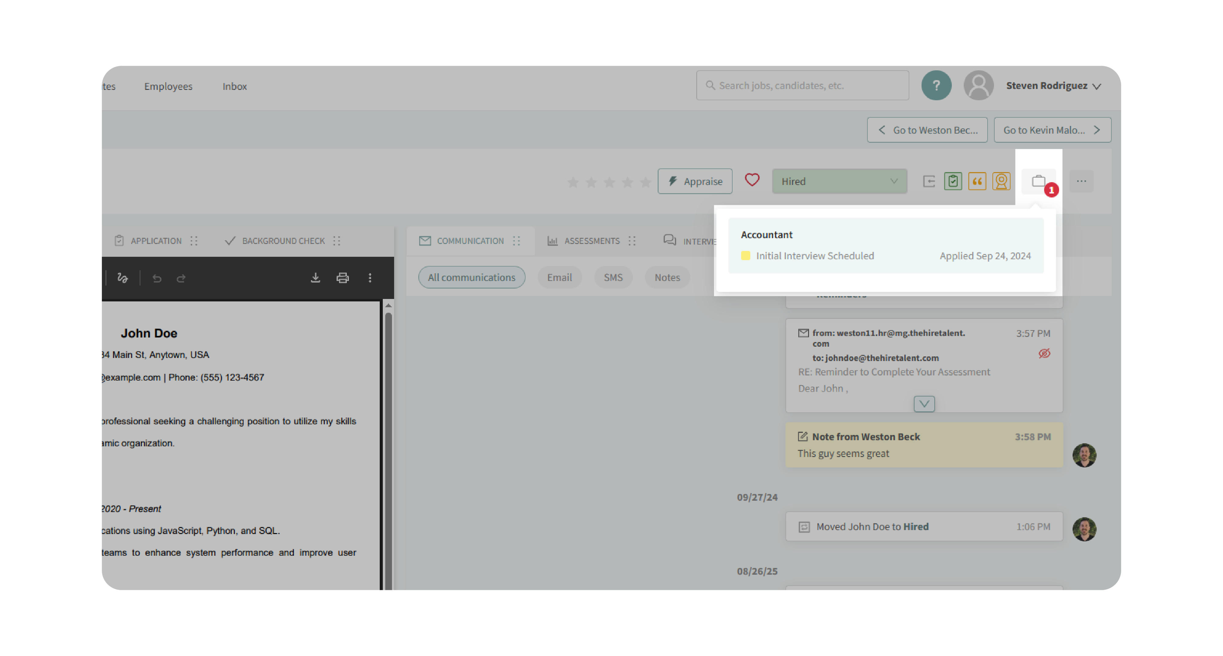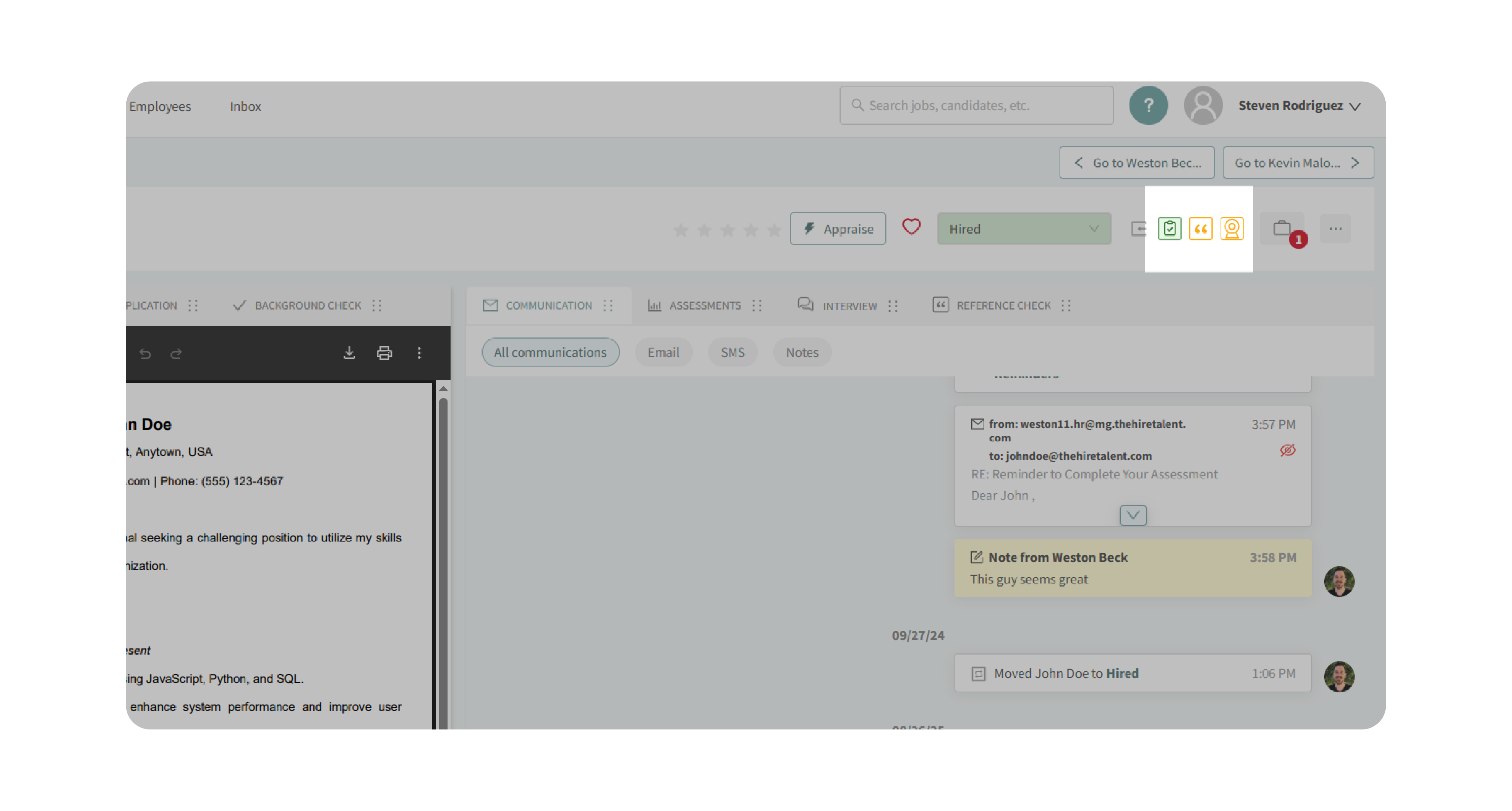 - Click the briefcase icon to check if the candidate is part of other job postings within your company.