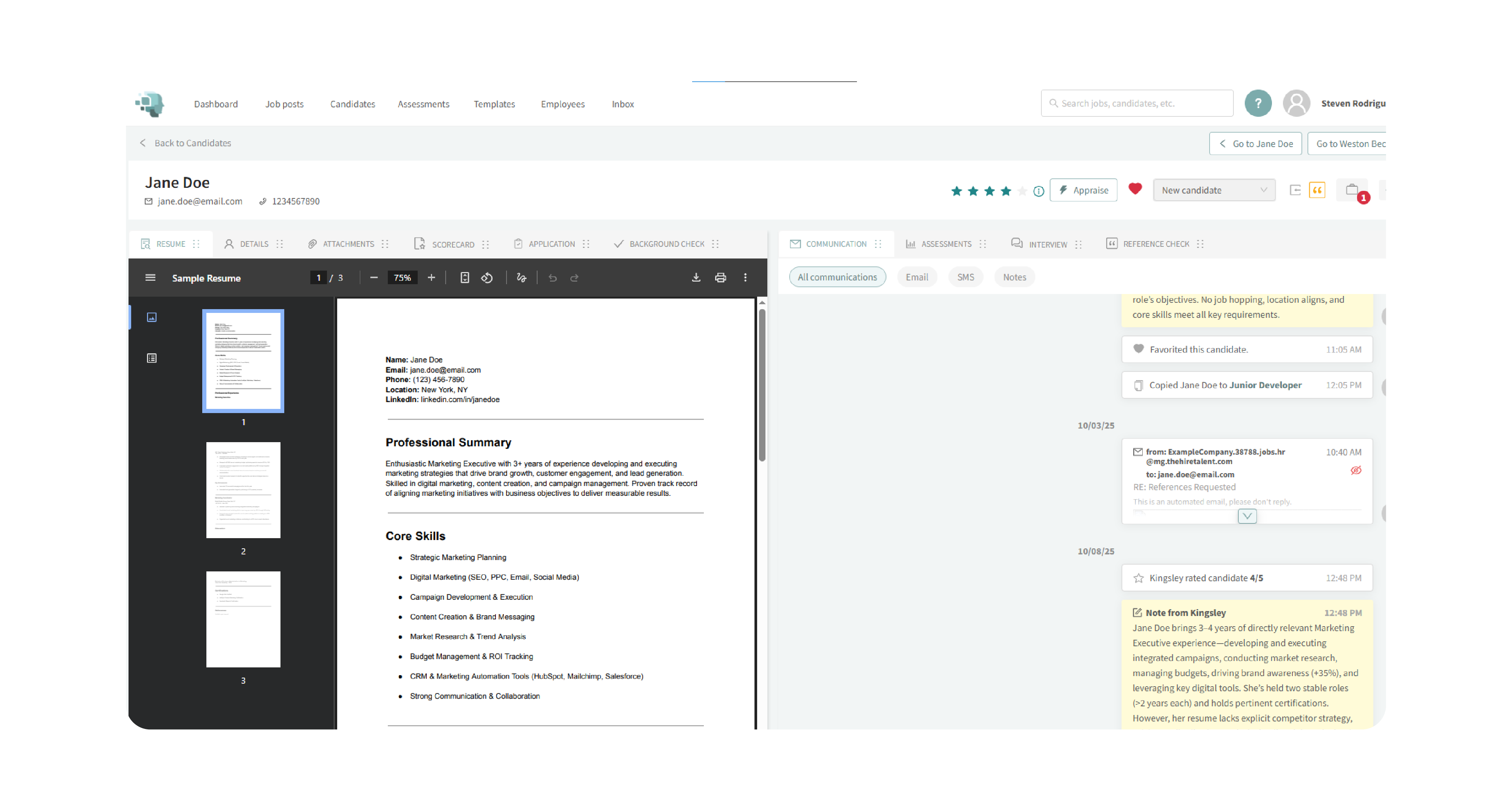 - Use the communications tab to centralize candidate interactions and reduce email clutter.