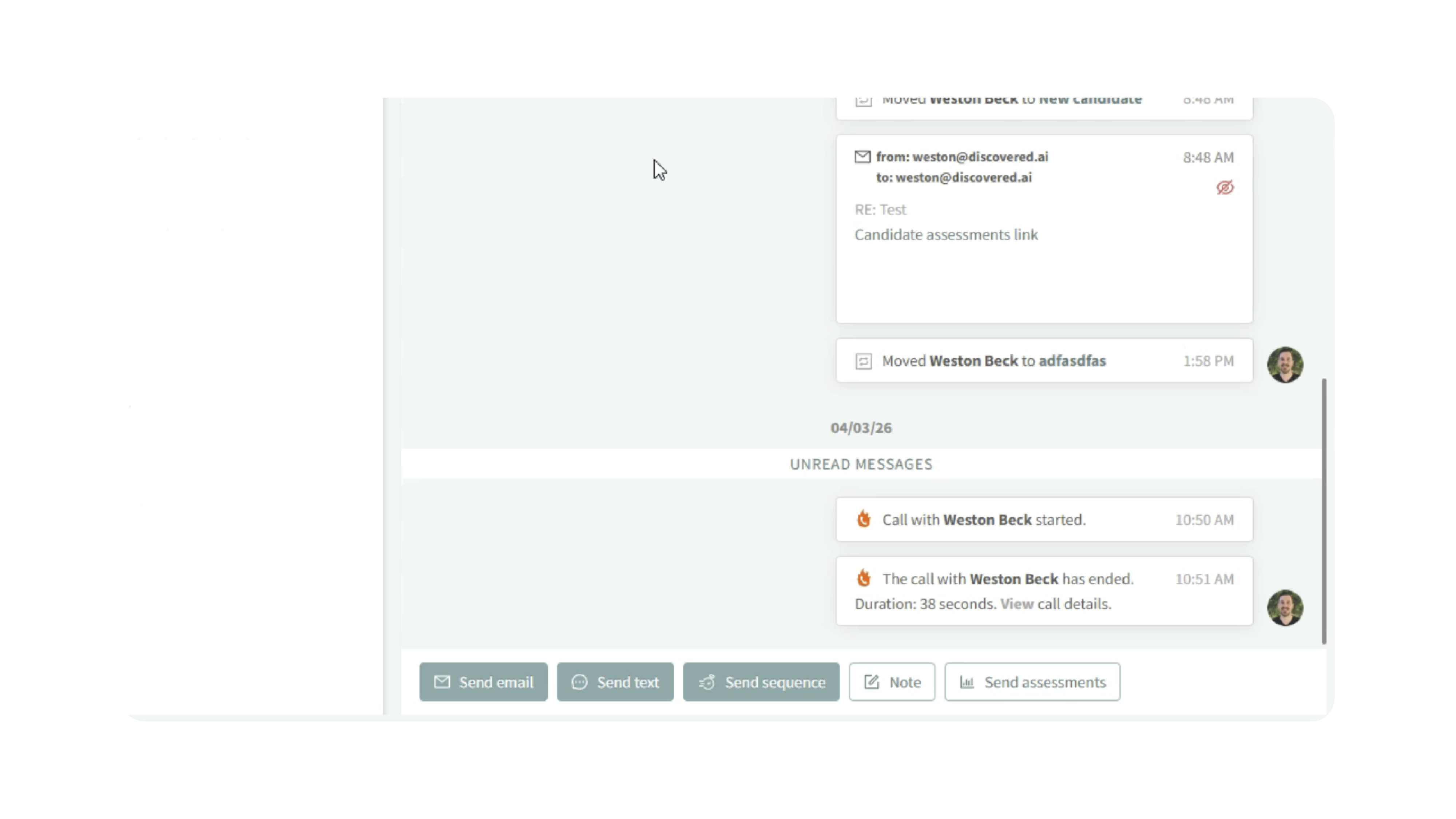 All call activity is logged in the candidate’s profile, including:
