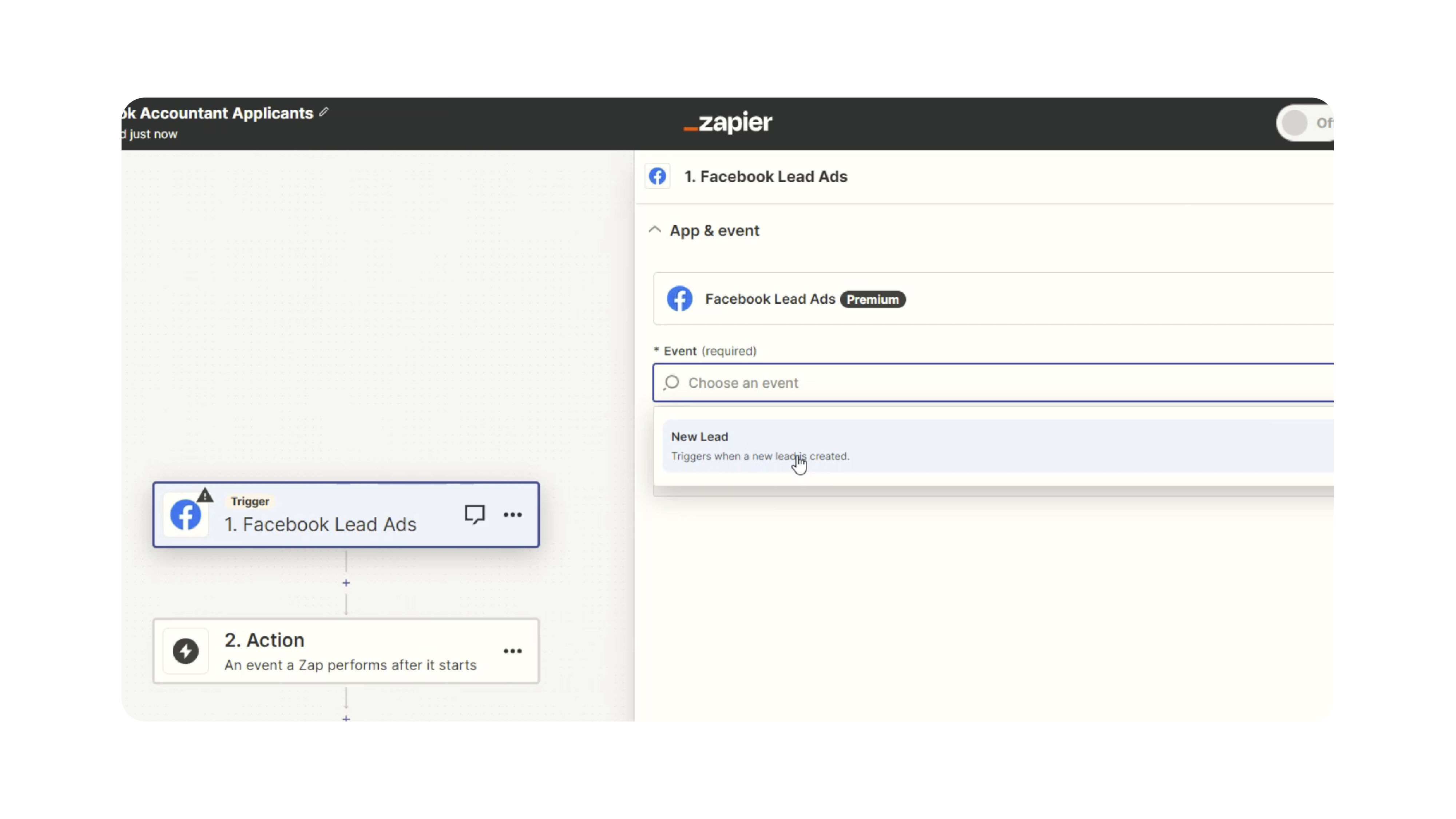 - Give your Zap a descriptive name (e.g., Facebook → Discovered – Accountant Applicants).