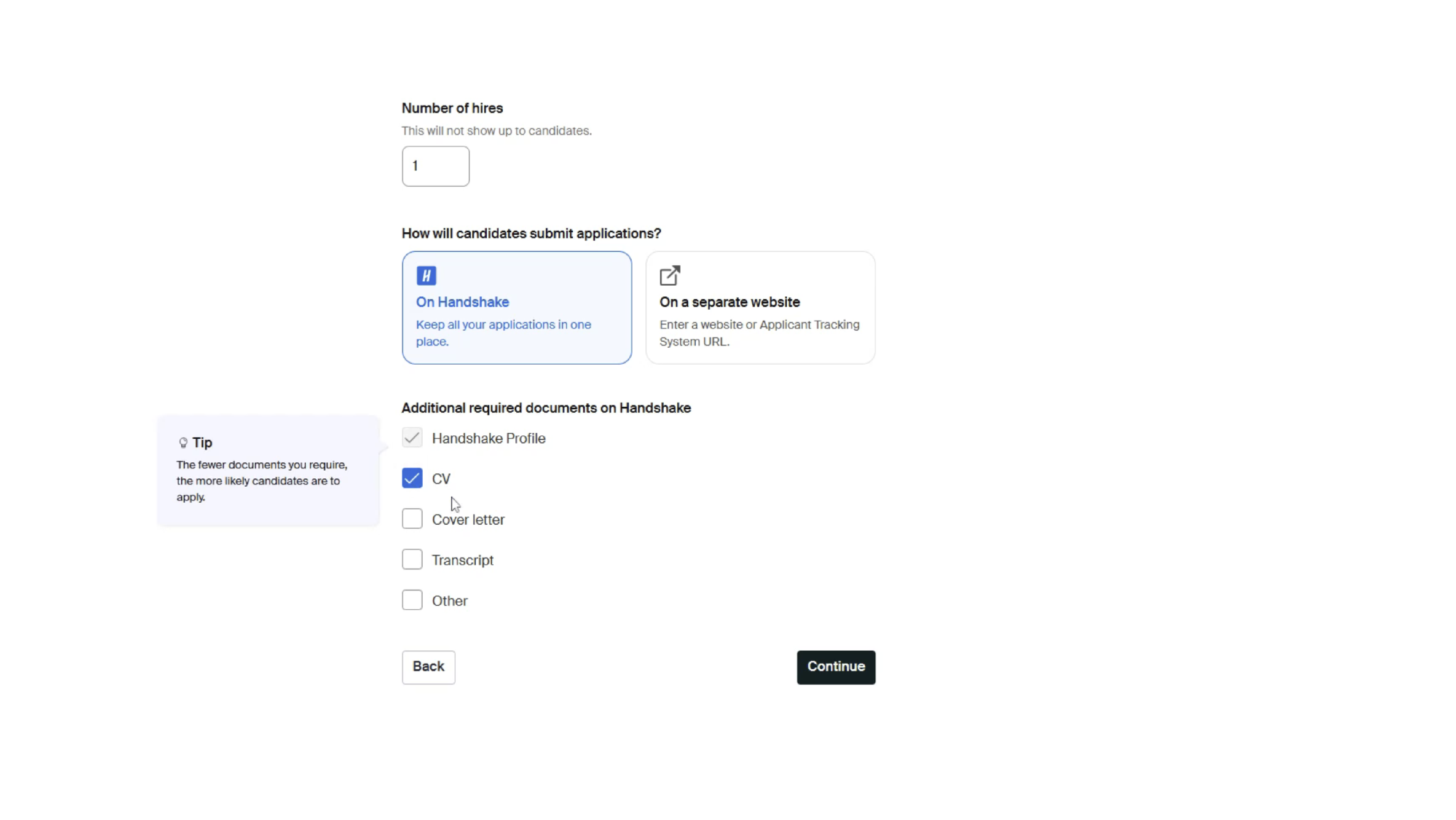 - Make sure CV submission is required — Handshake will not send data without a document.