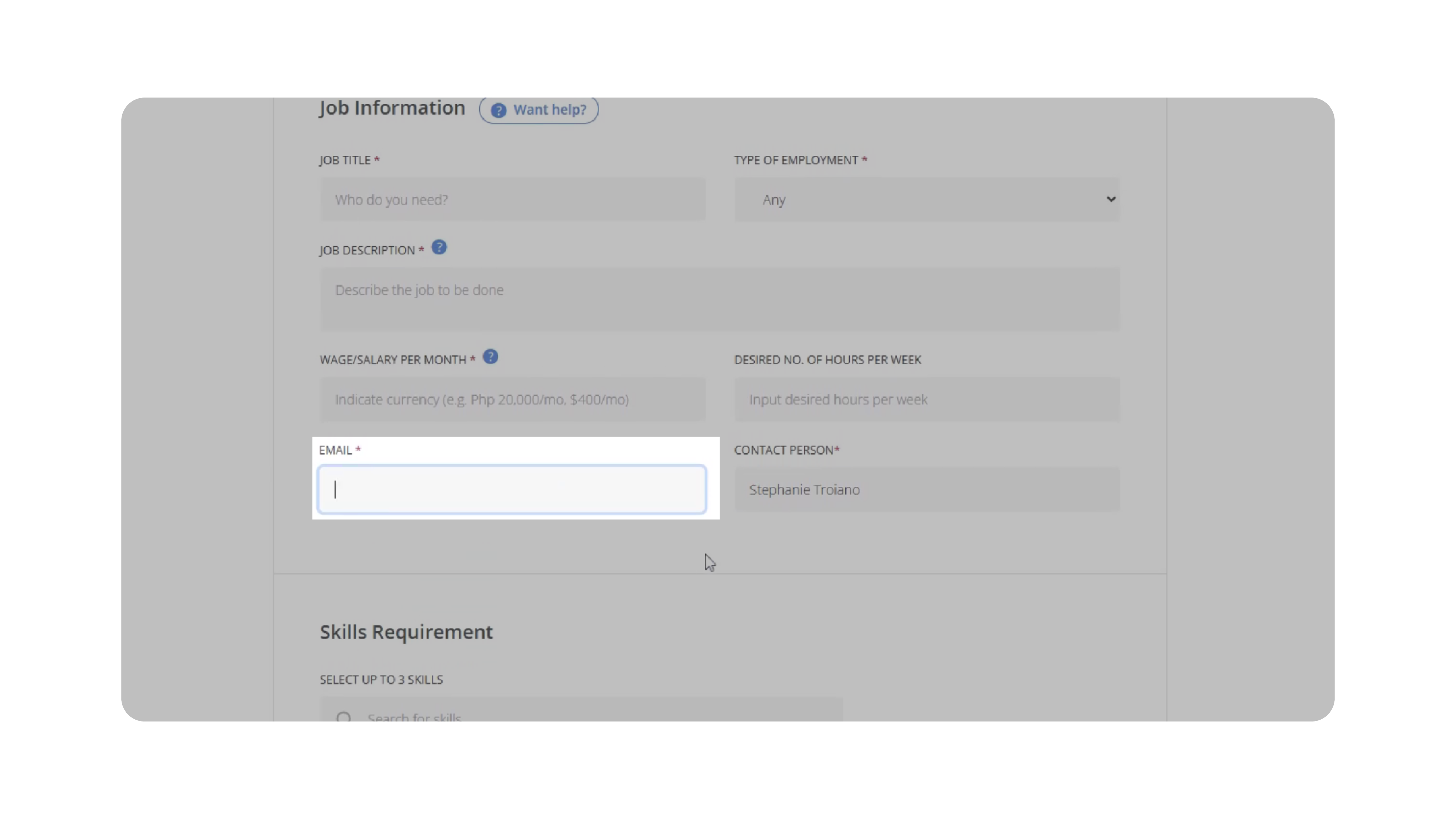 - Locate the Email field on the OnlineJobs.ph posting form.