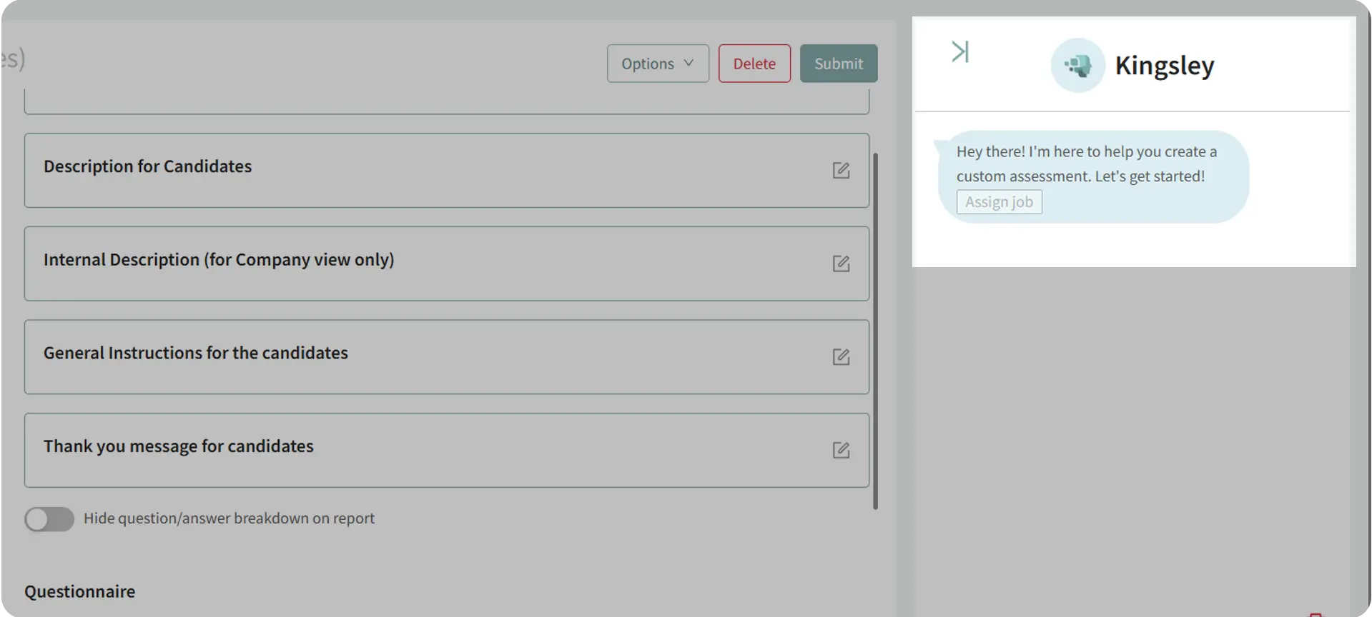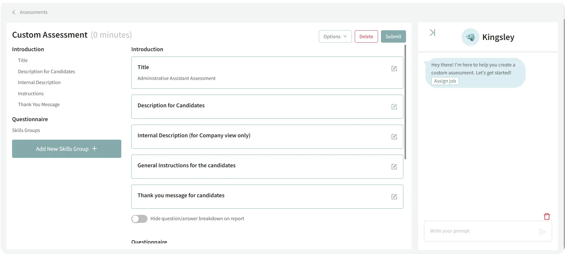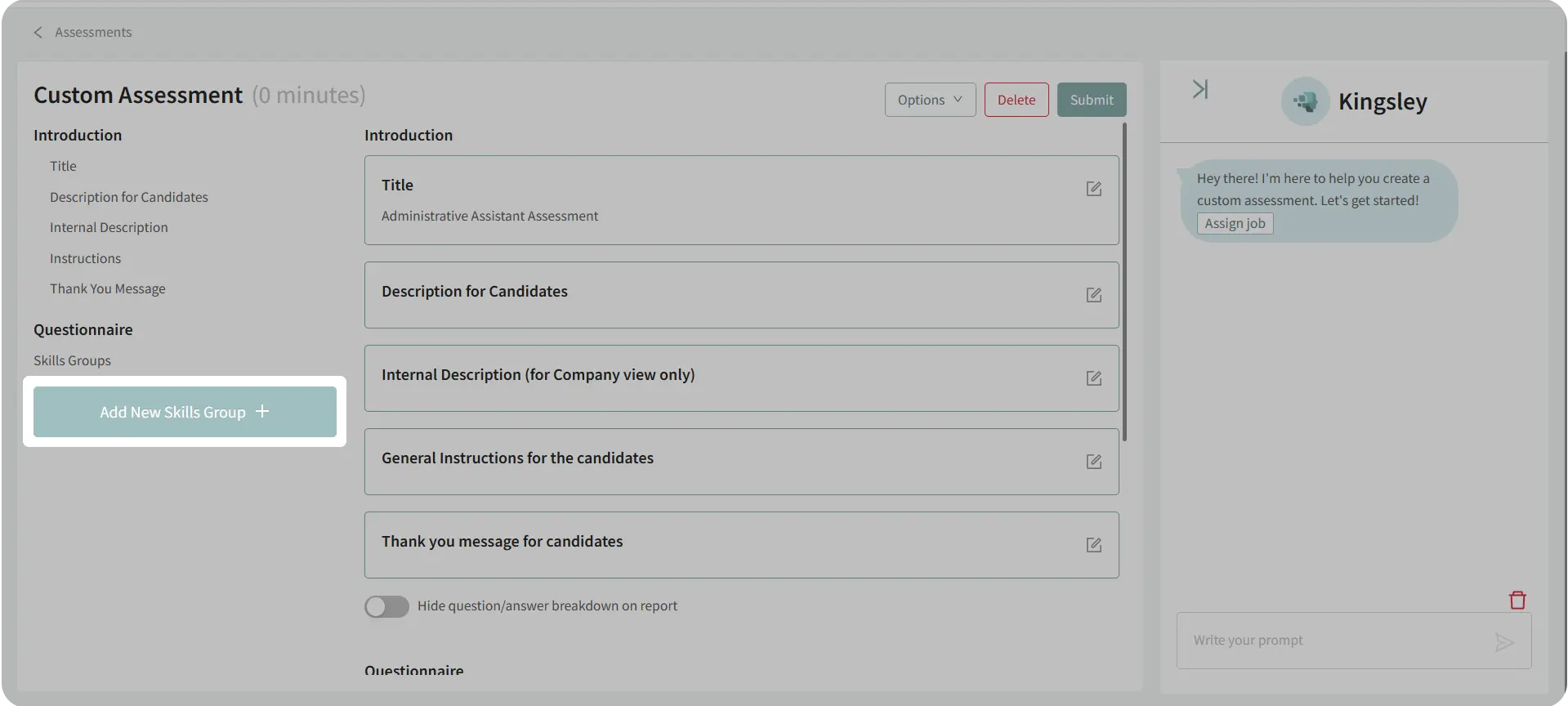 Custom Assessments in Discovered allow you to create fully personalized skill tests for any position. You can build assessments manually from scratch or use Kingsley, your built-in AI assistant, to generate assessments automatically based on a job description.