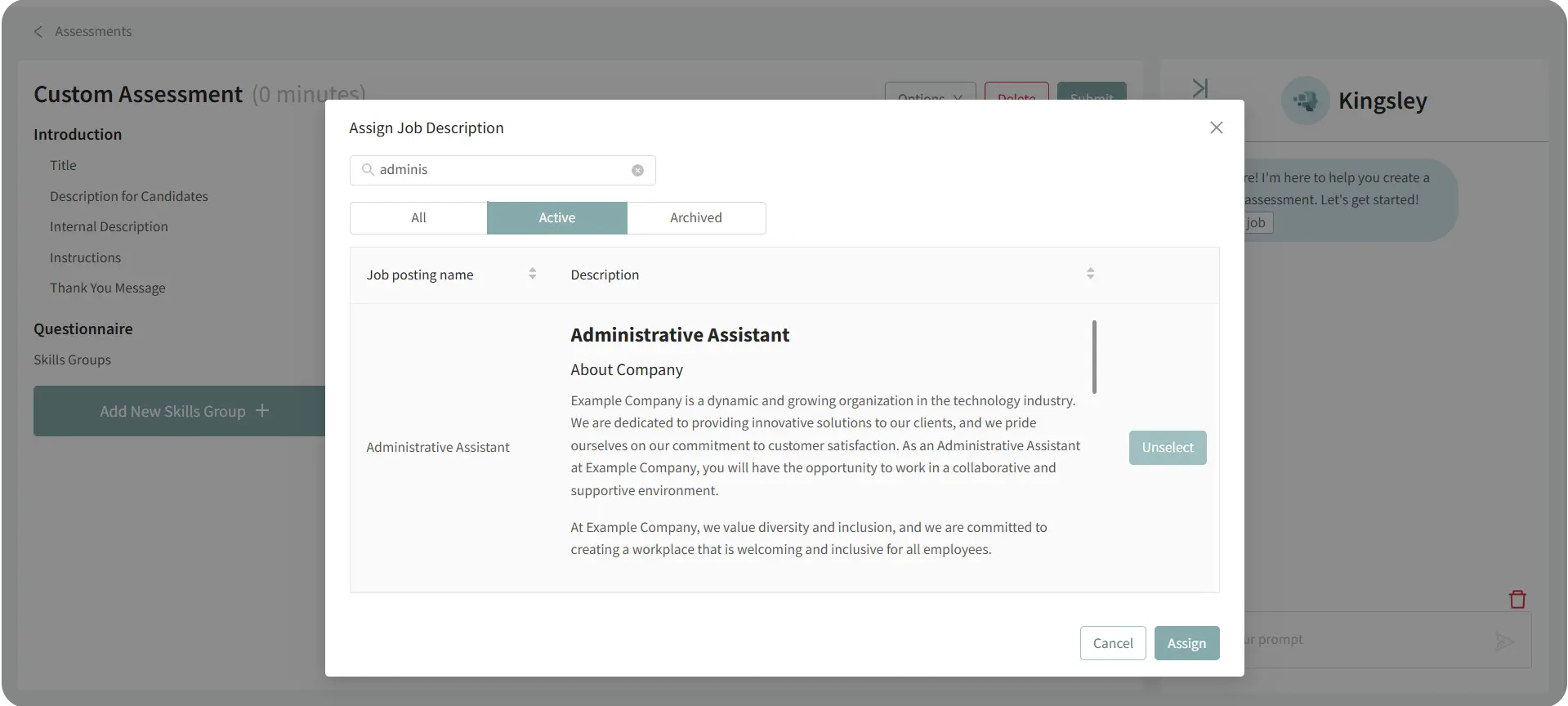 - Kingsley will analyze the job description and suggest relevant skills and qualities to assess.
