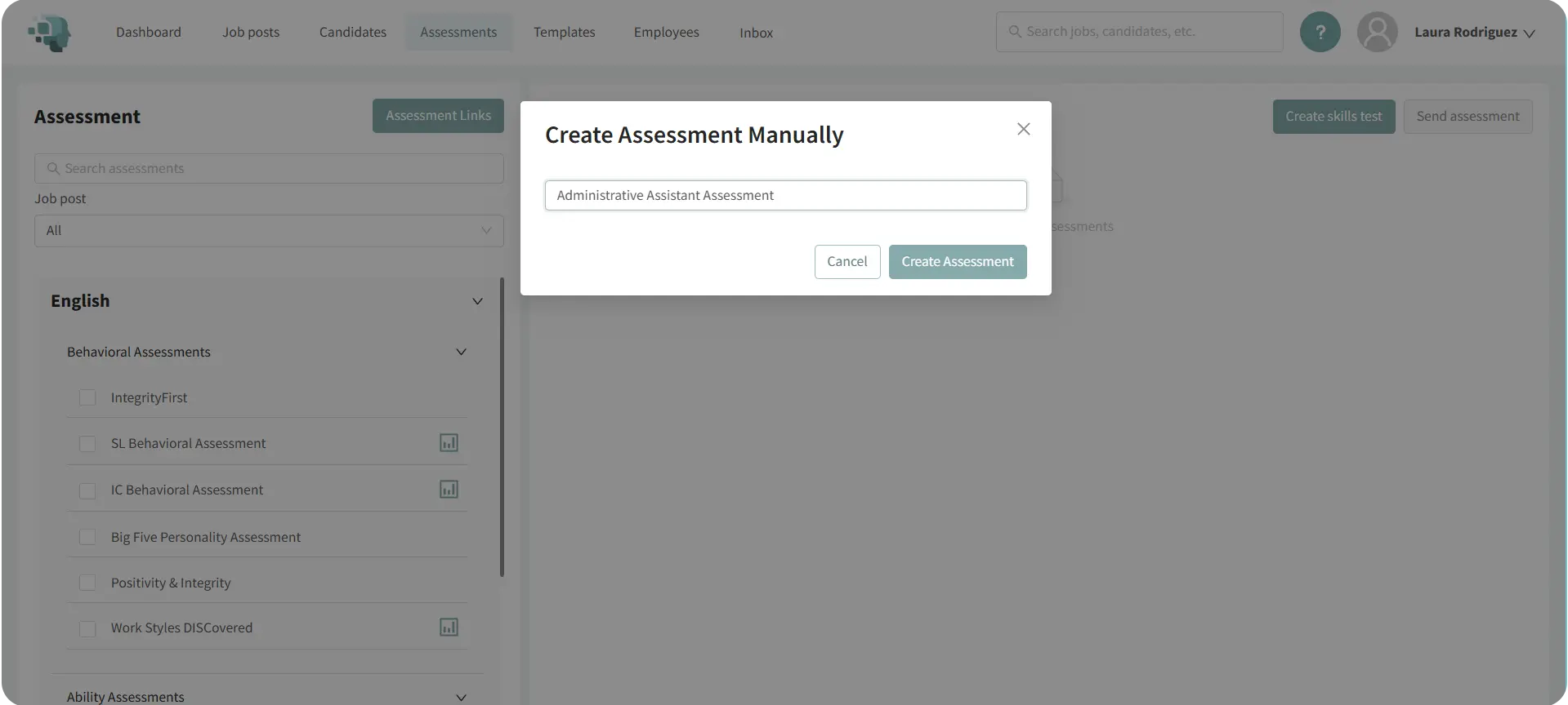 - Enter a name for your assessment (e.g., Administrative Assistant Assessment).