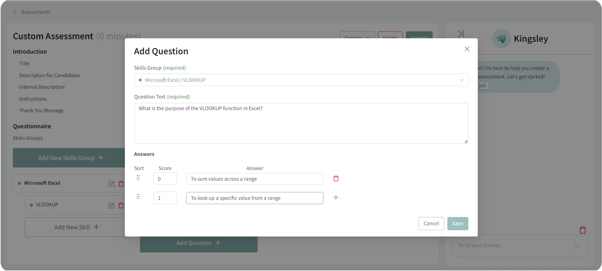 - Once ready, Kingsley will generate a complete assessment—including skill groups, questions, and scoring.