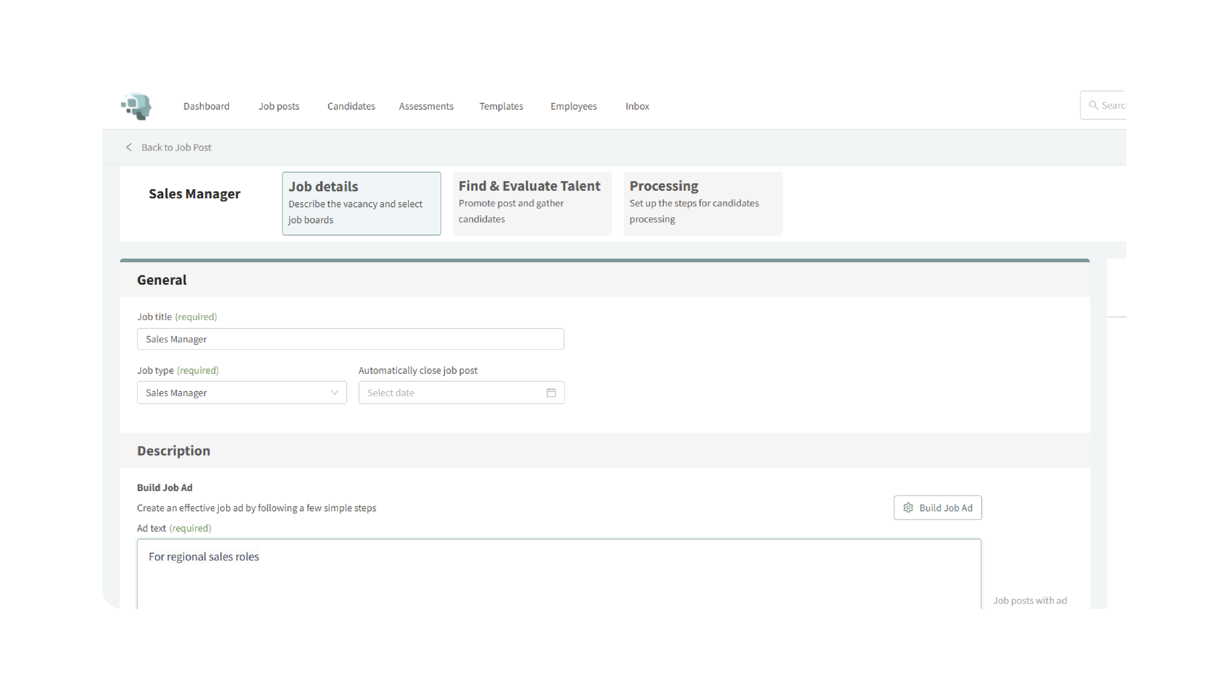 - Update or modify fields in the Job Details, Find & Evaluate Talent, and Processing tabs.