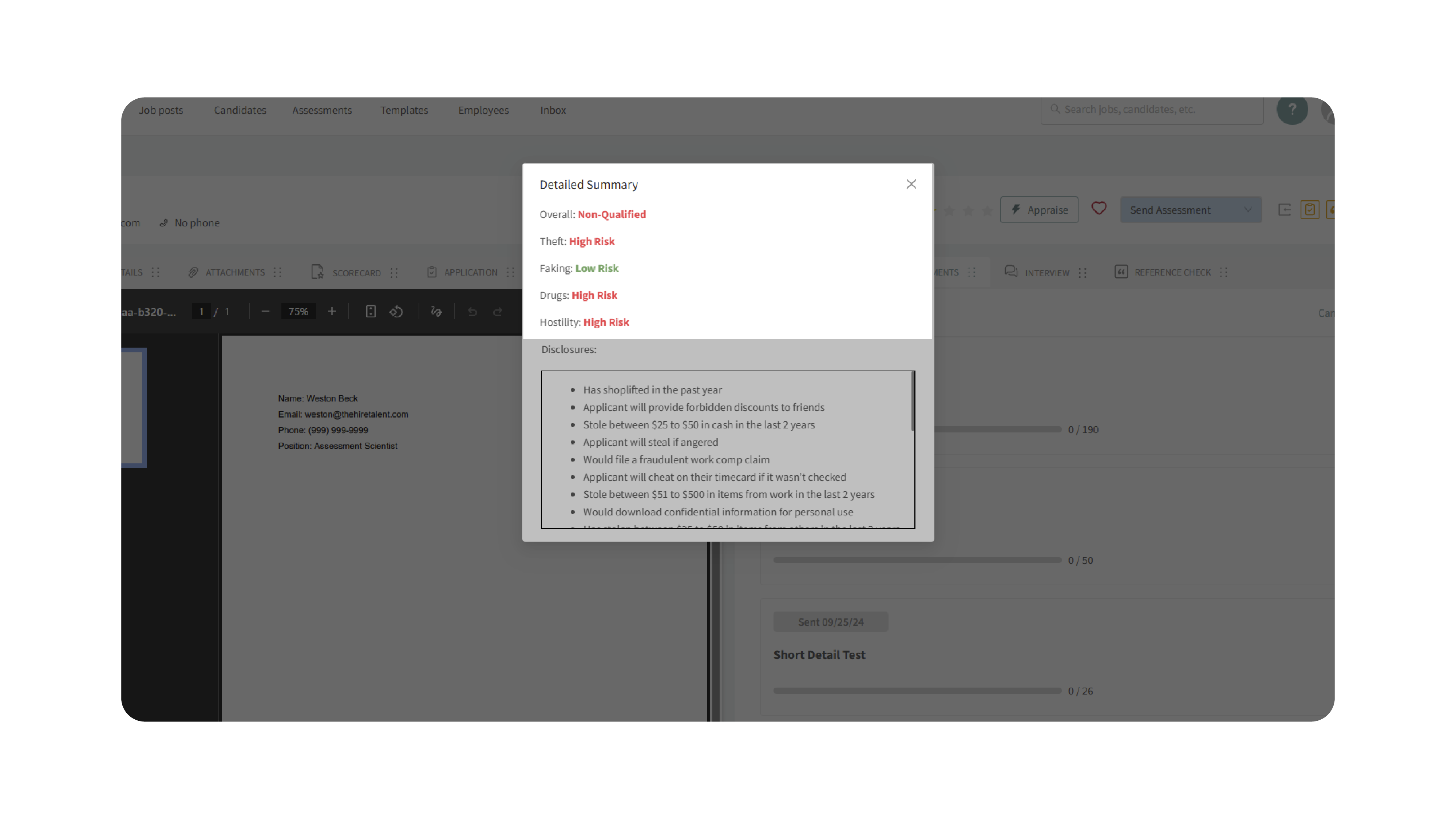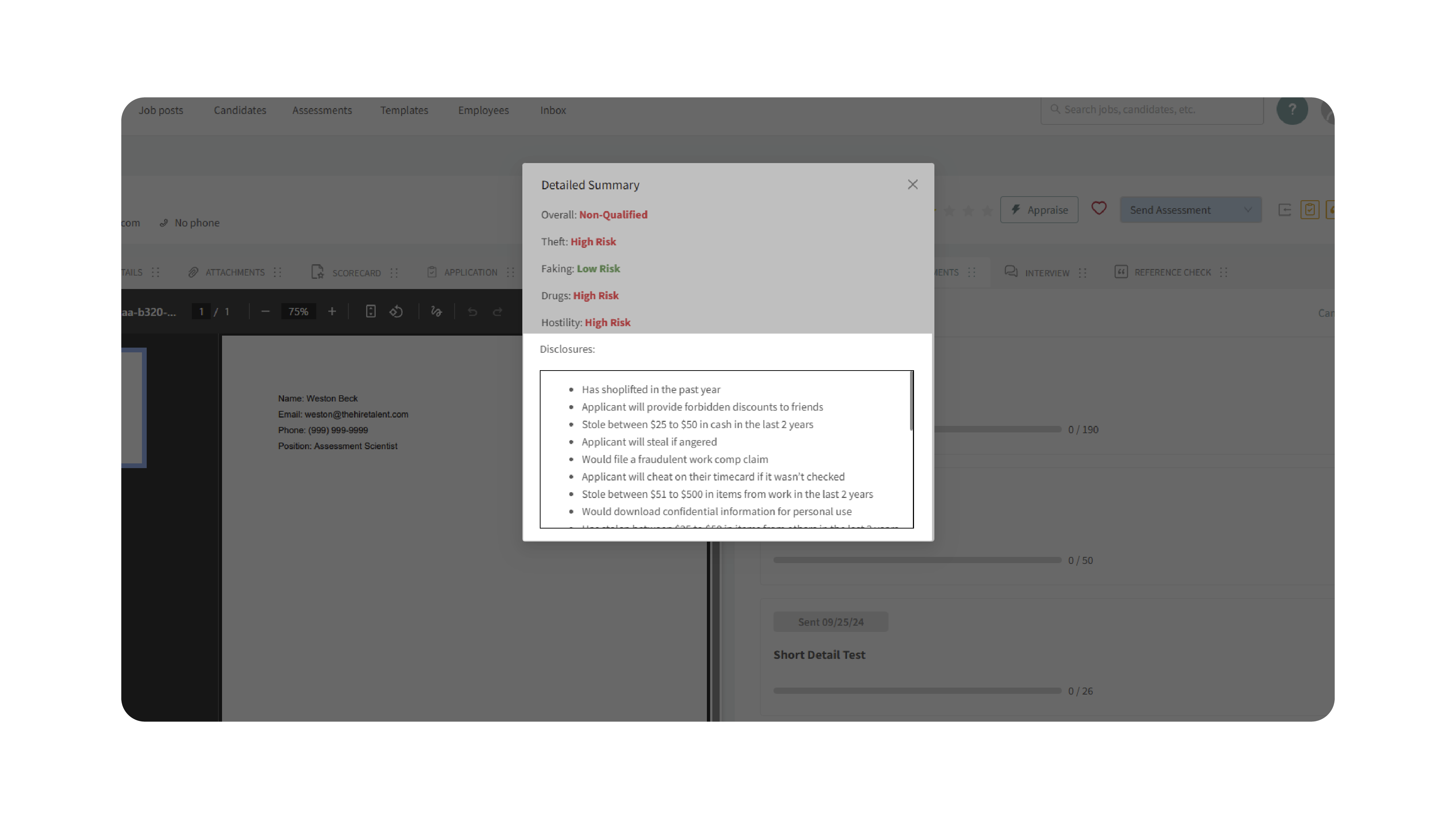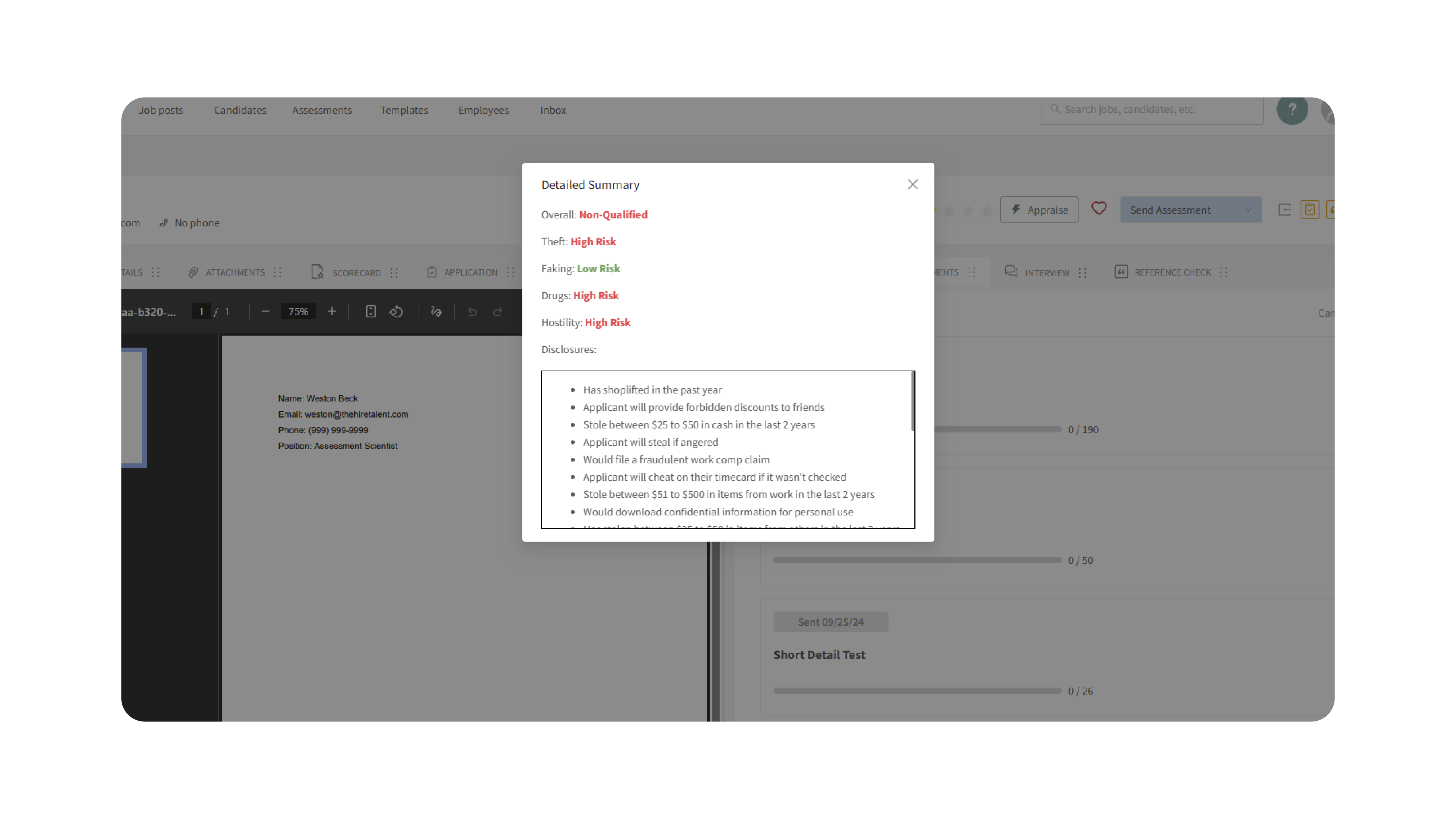 - Hiring teams can access detailed summaries, including any risk disclosures.