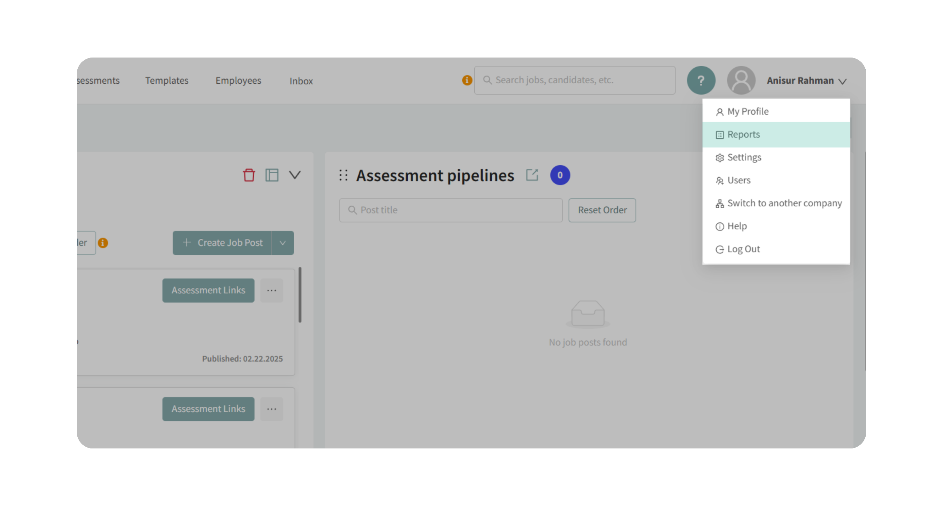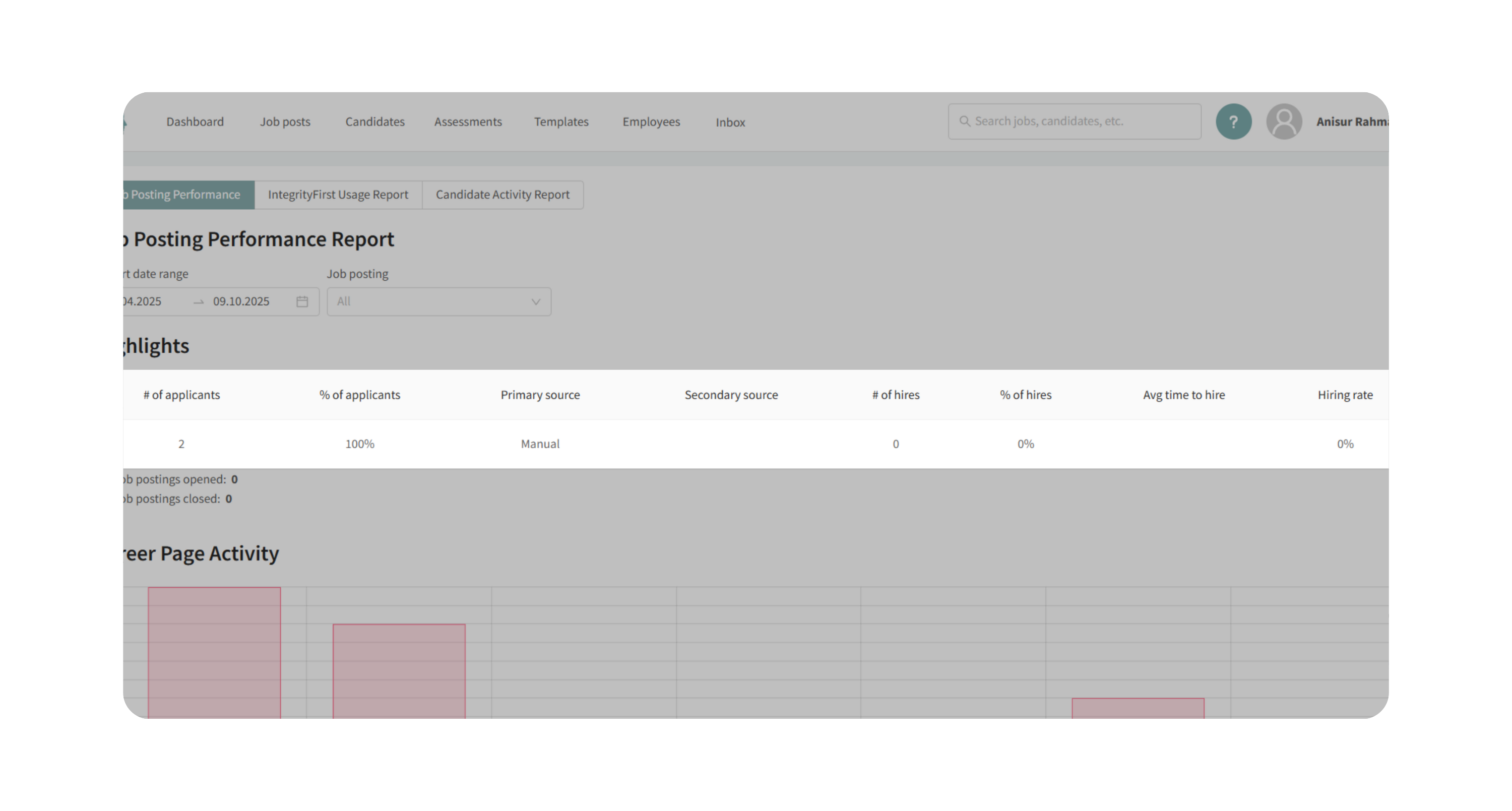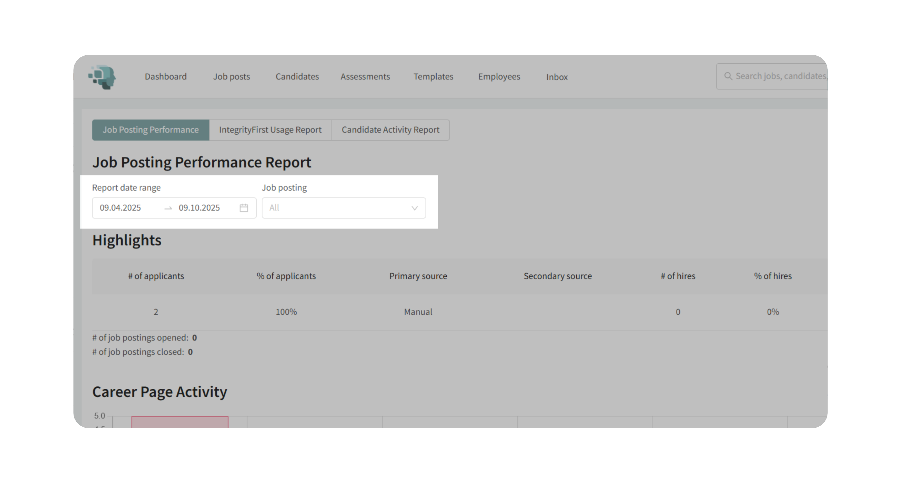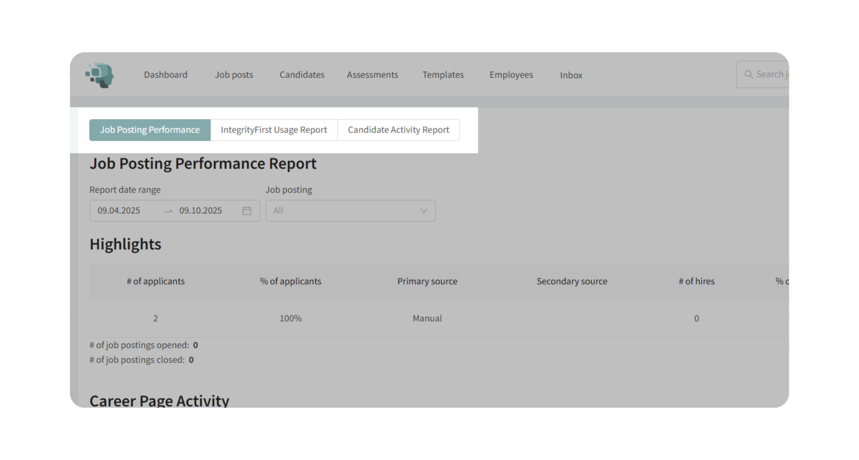 You can switch between Job Posting Performance and Integrity First Usage Reports at any time under the Reports tab.
