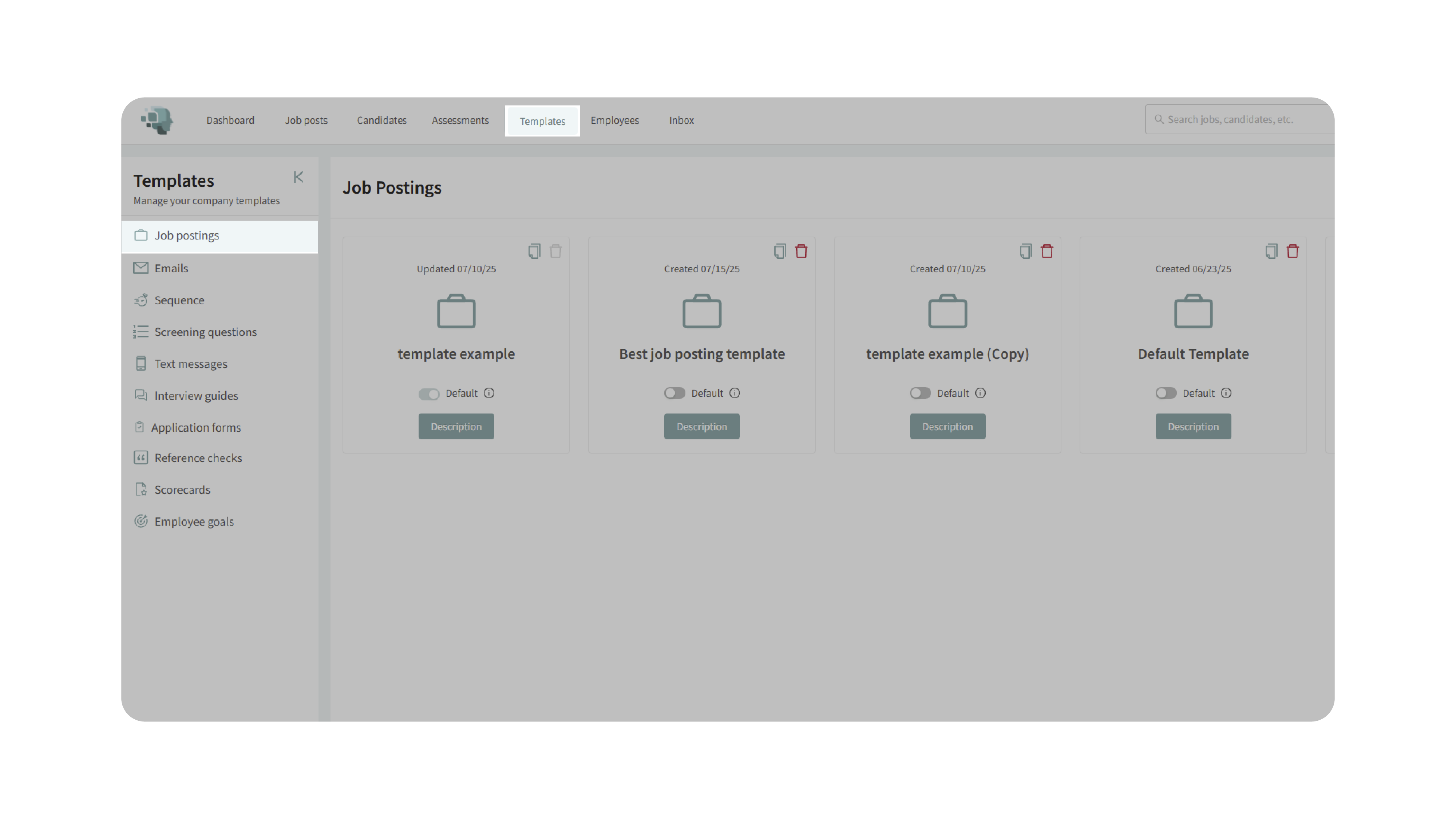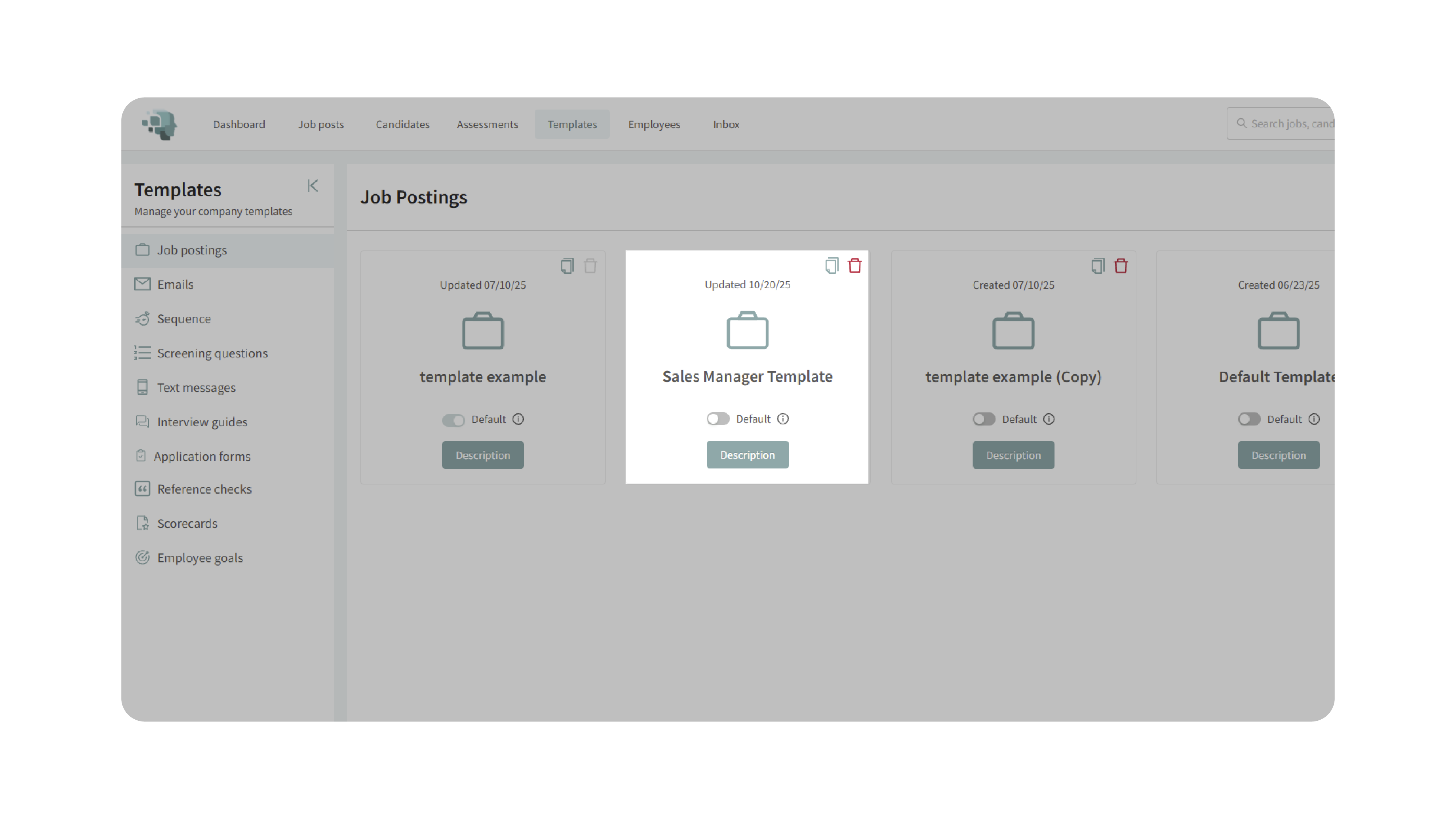 - From your Dashboard, hover Templates (top nav) → select Job Postings to view, create, or manage templates.