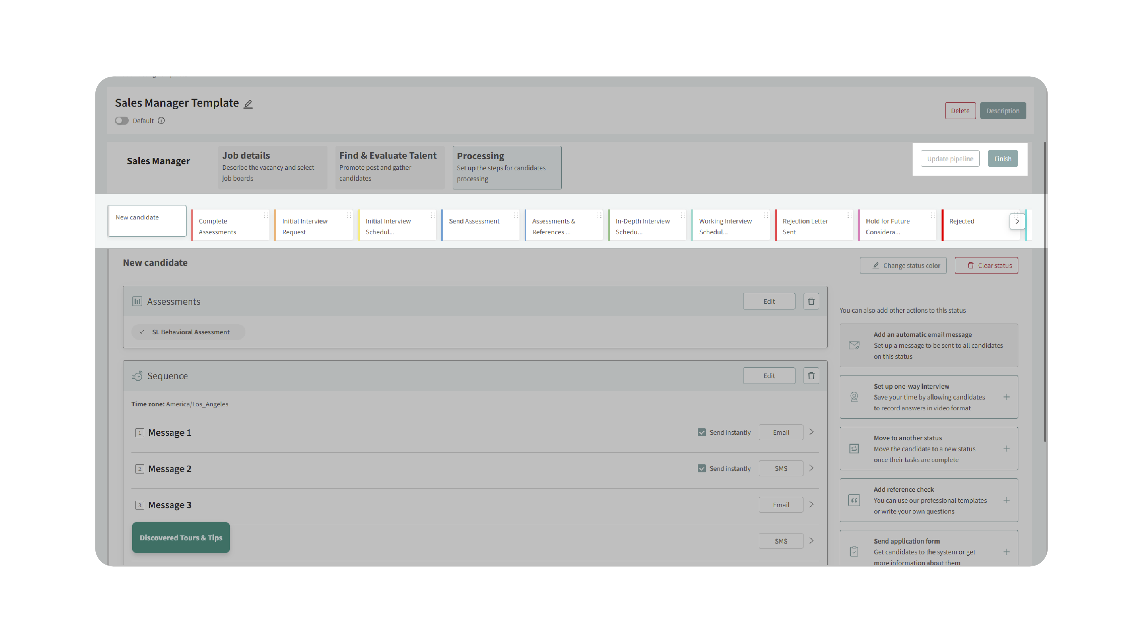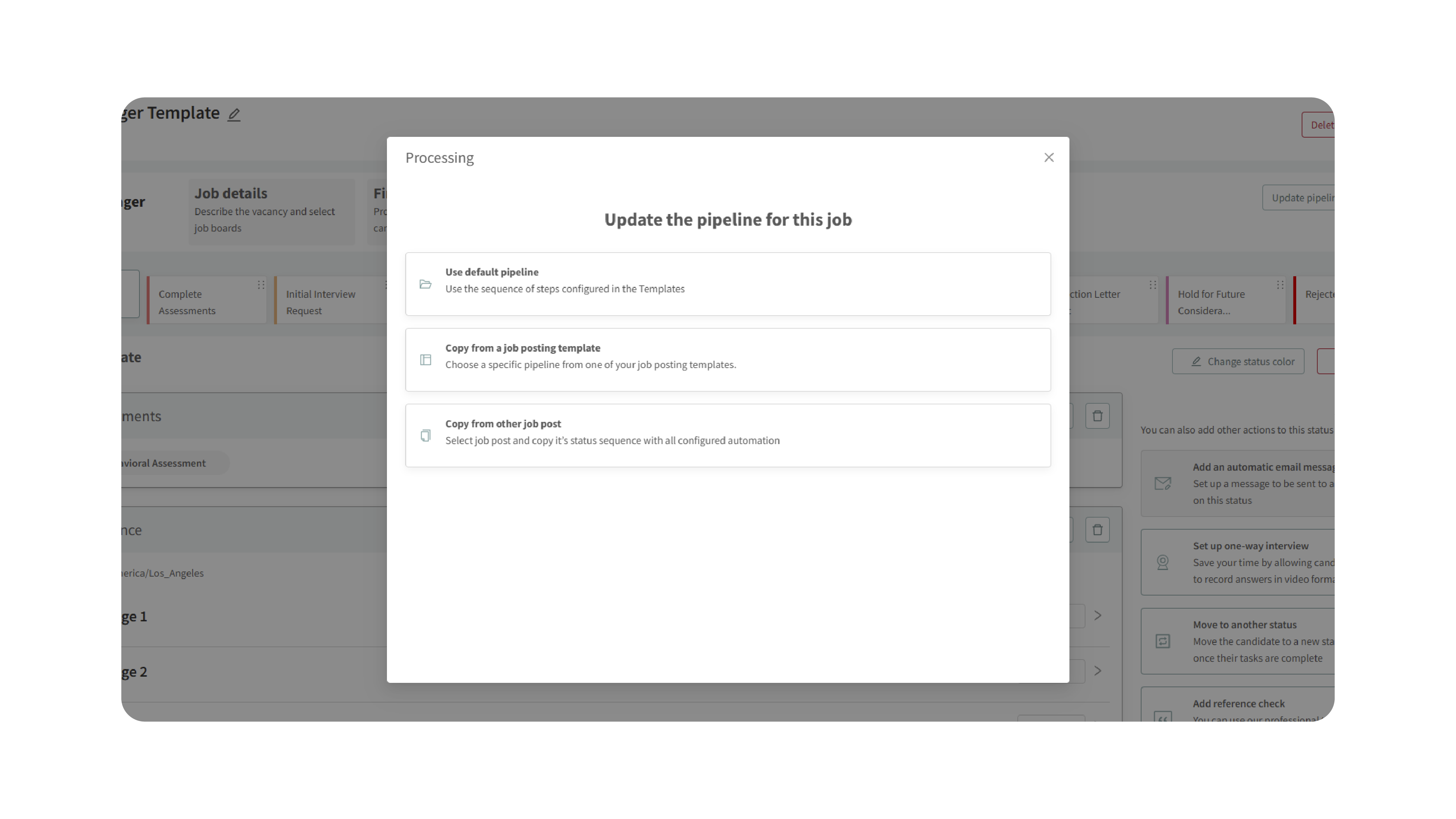 - In Processing, choose how the hiring stages should load for jobs created from this template: