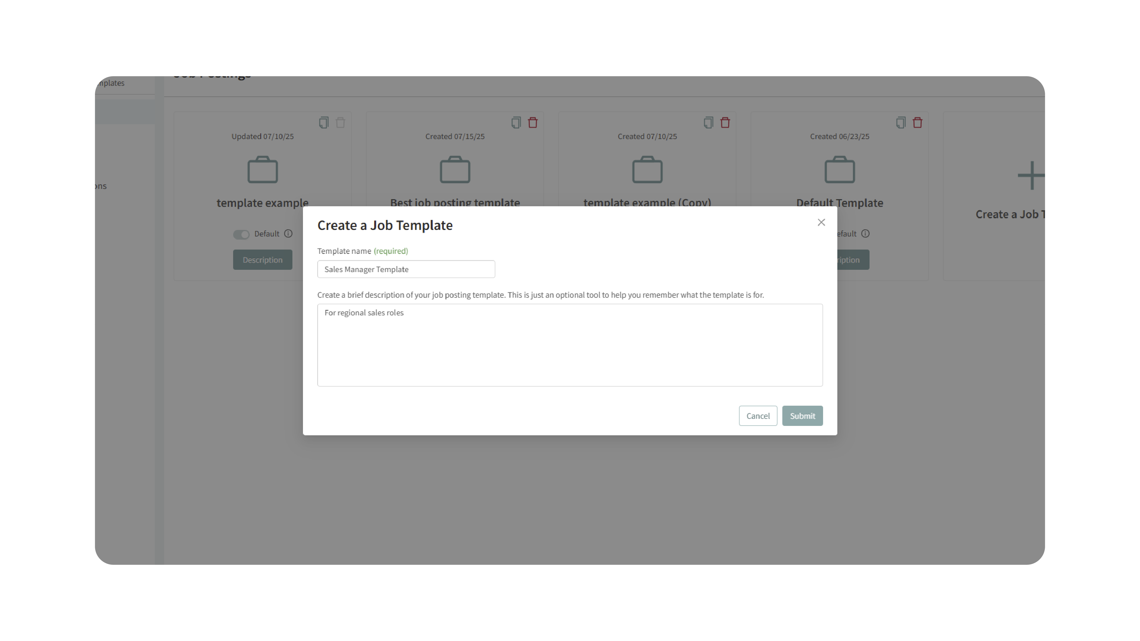 - Click Create Job Template, name it (e.g., “Sales Manager Template”), and optionally add a description (e.g., “For regional sales roles”). Click Submit.
