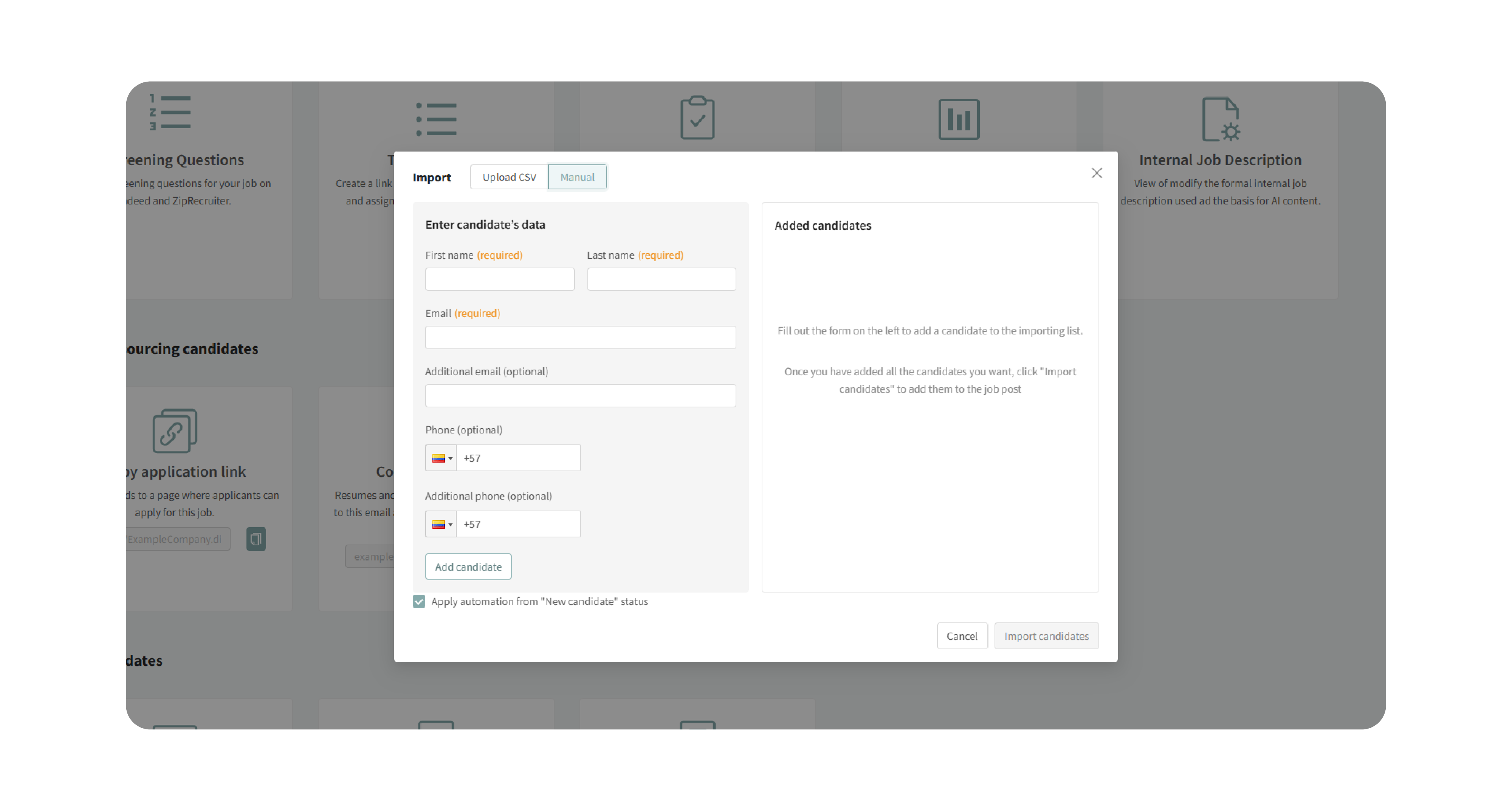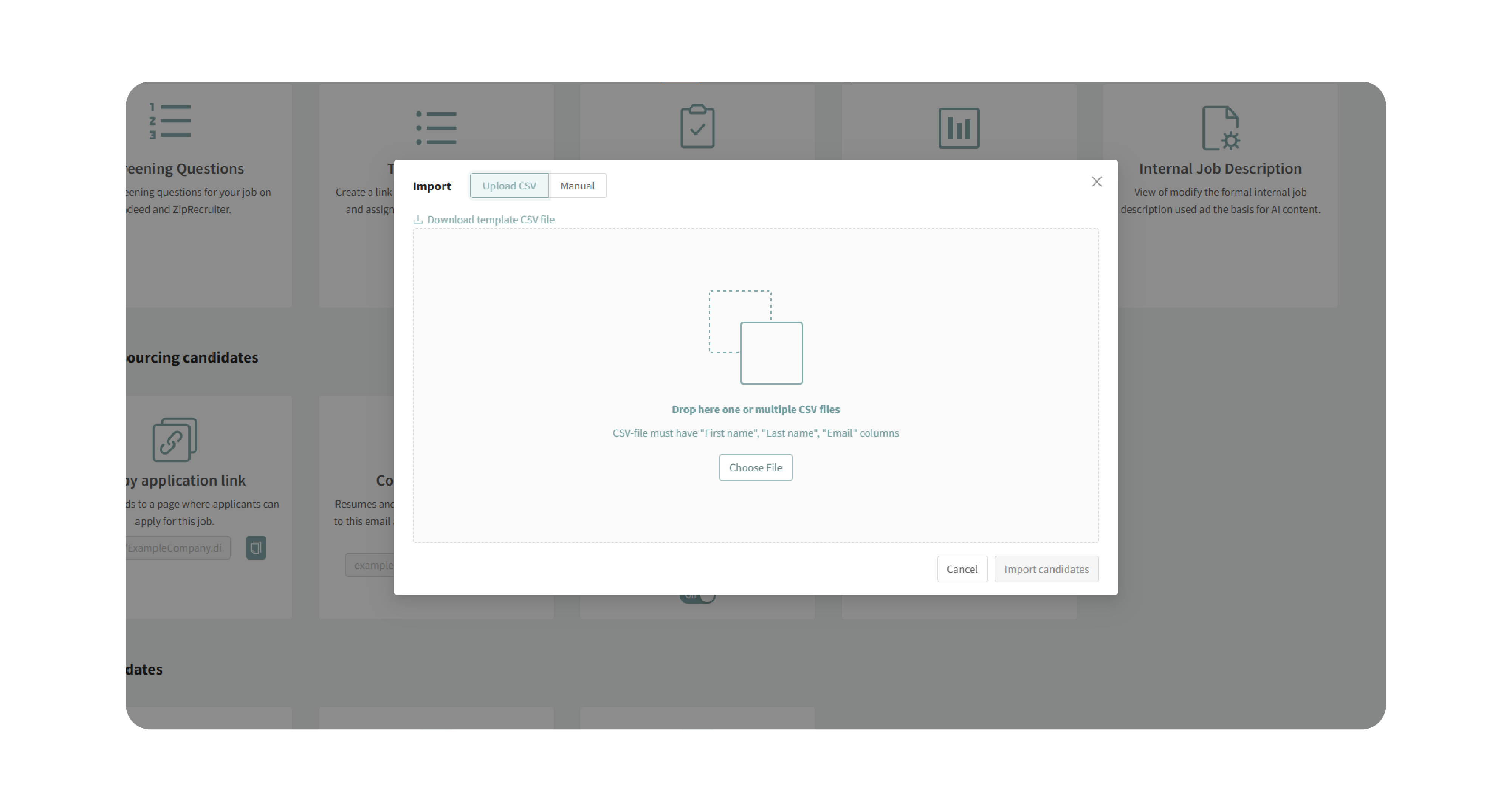 Manual Import helps you quickly consolidate large lists of candidates into your hiring pipeline. By standardizing candidate data during import, it reduces errors, saves time, and ensures your hiring team has all applicant information in one place.