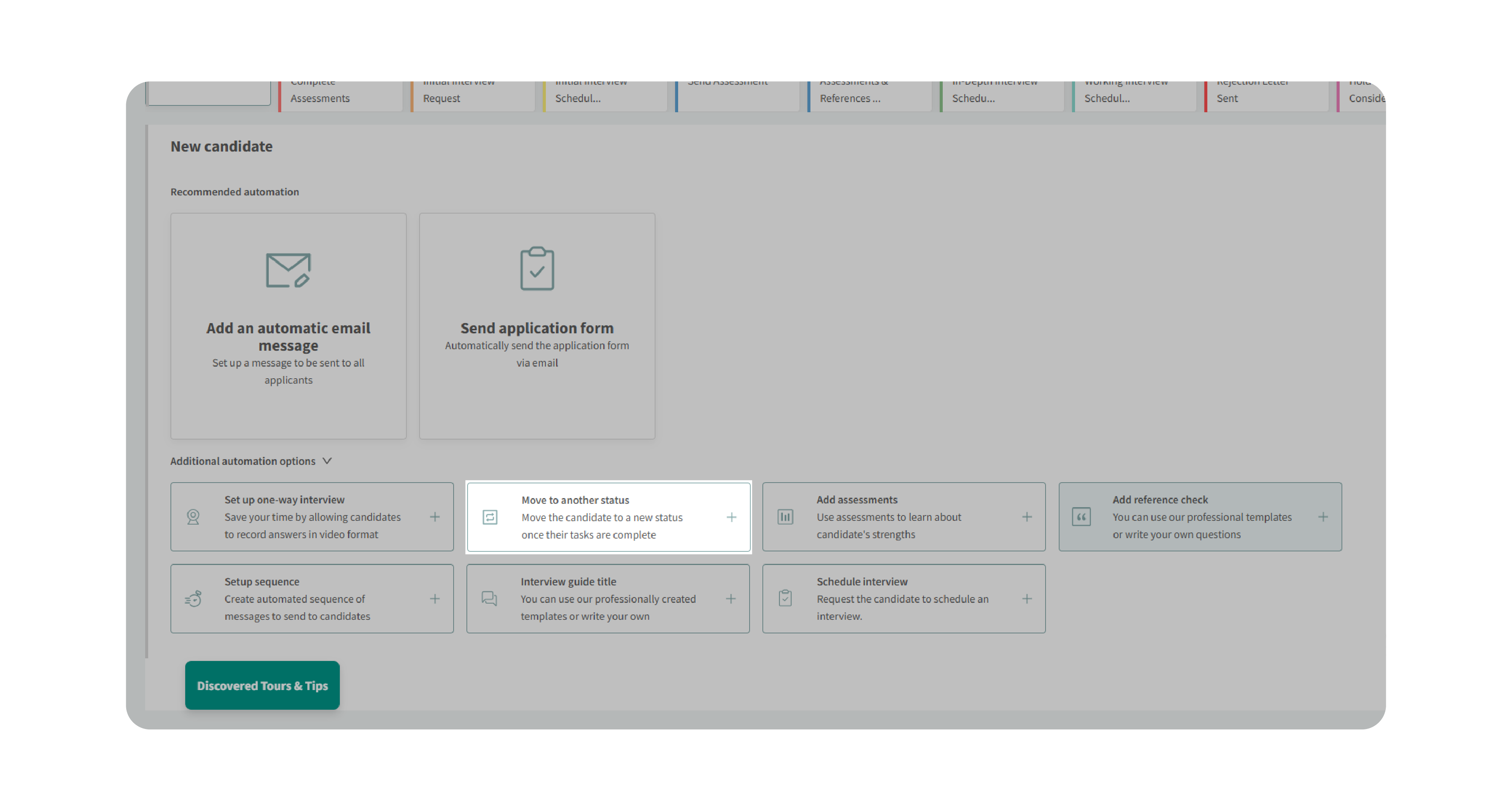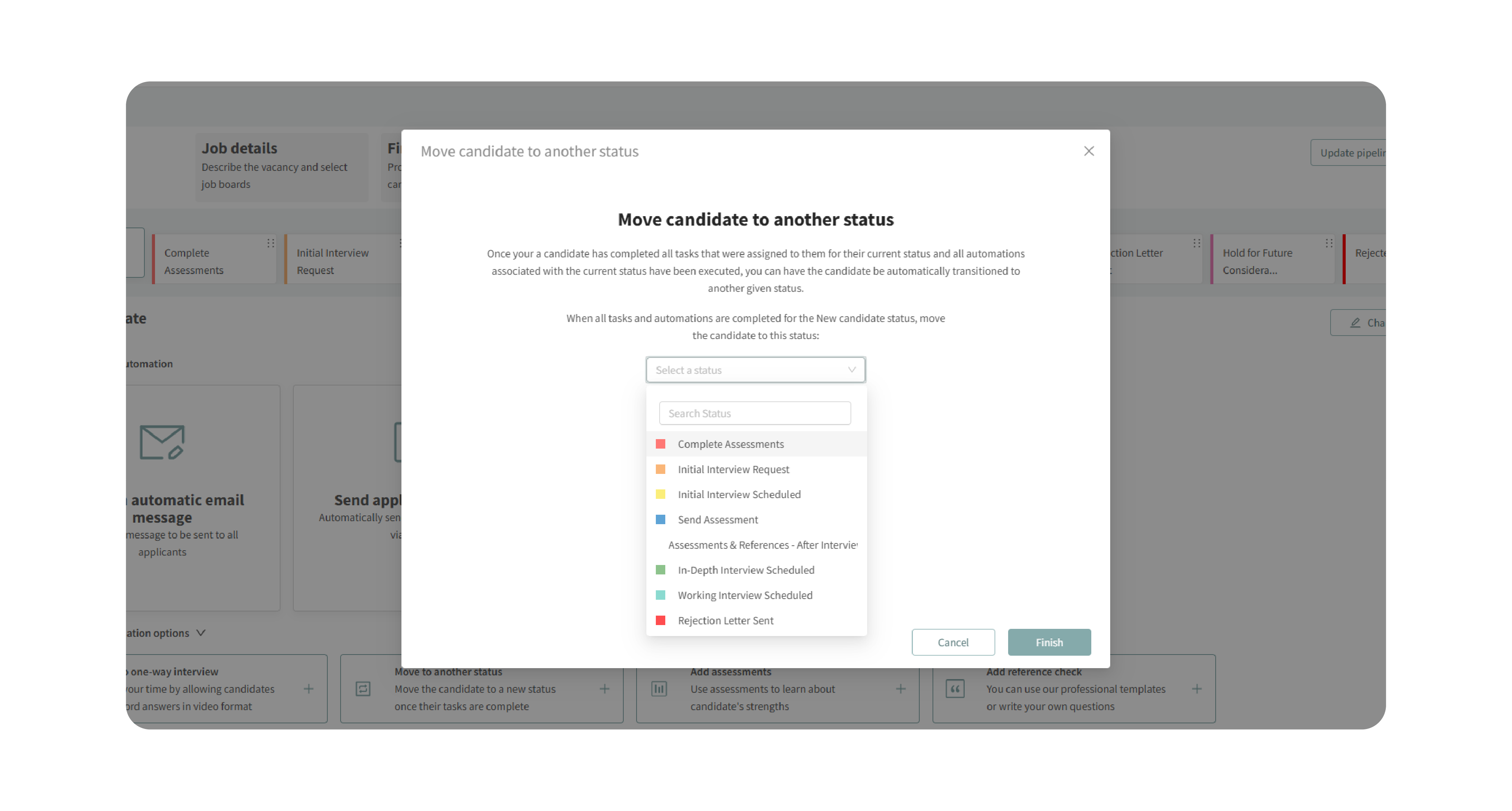 For example, if a candidate schedules an interview, the system can automatically move them to the next step (e.g., Initial Interview Scheduled). This feature works with any automation—assessments, reference checks, application forms—and ensures candidates flow smoothly through your process without requiring manual updates.
