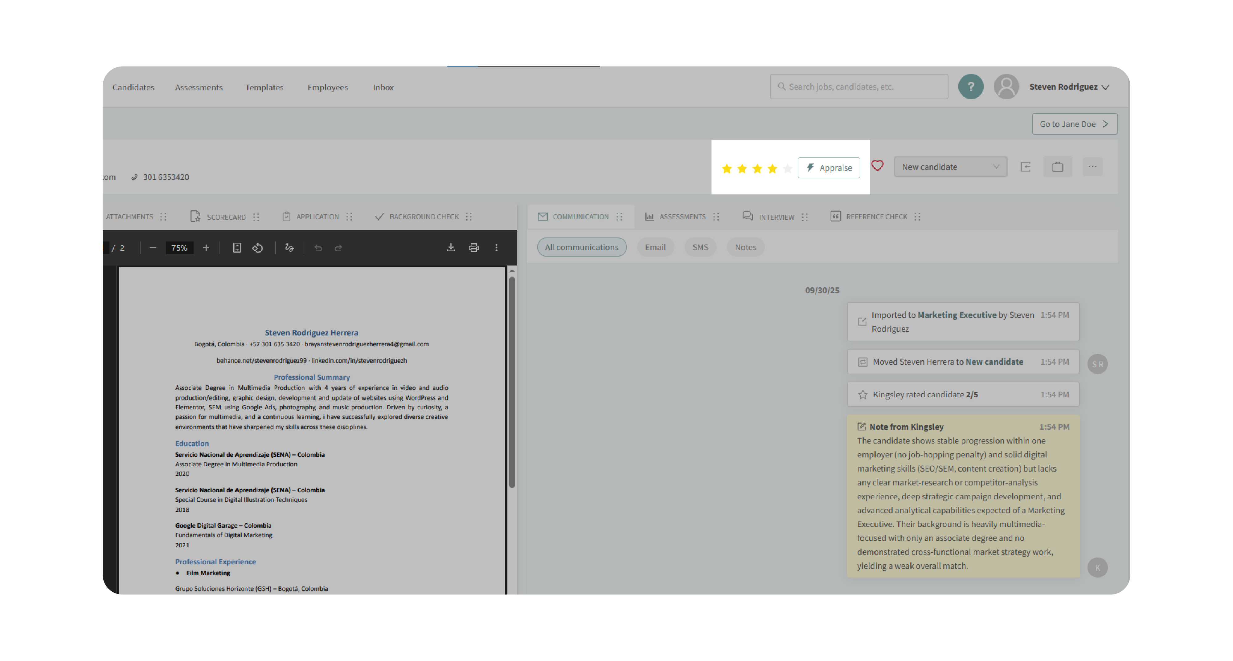 Star ratings create a consistent, visual way to compare candidates and streamline decision-making. By combining manual input with AI-powered analysis, you can: