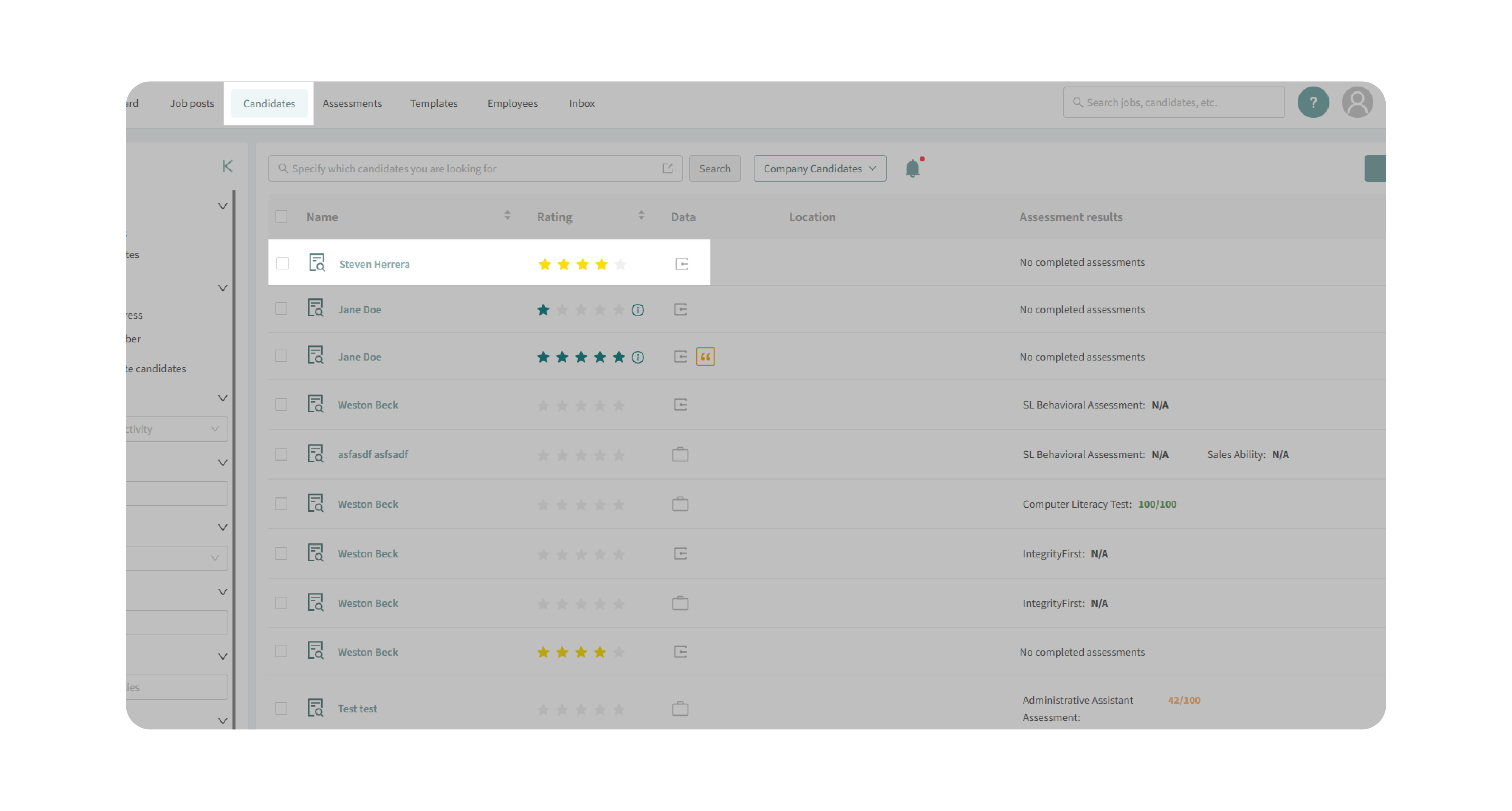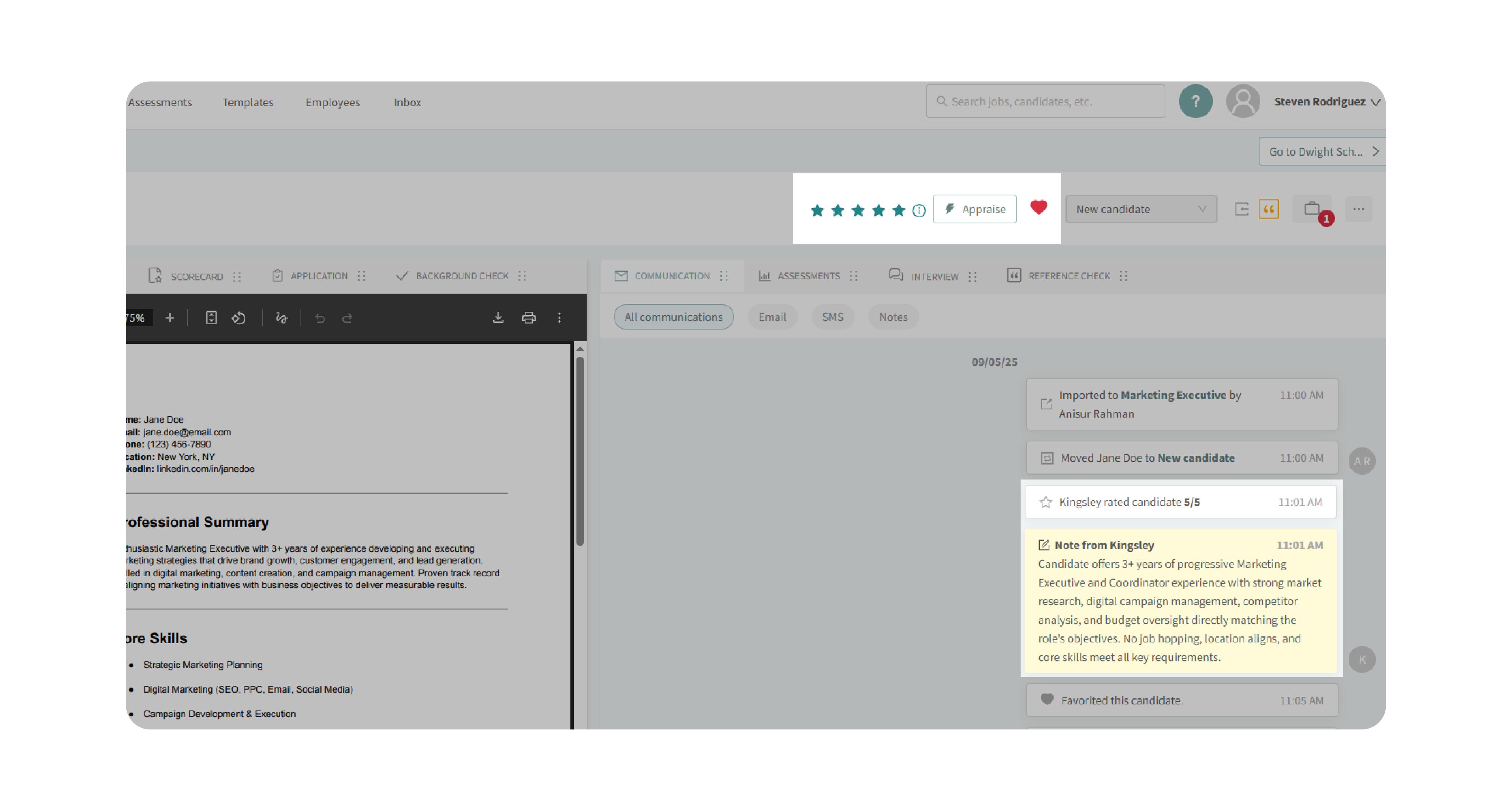 - Ratings remain tied to candidate profiles, so you can revisit and adjust as needed.