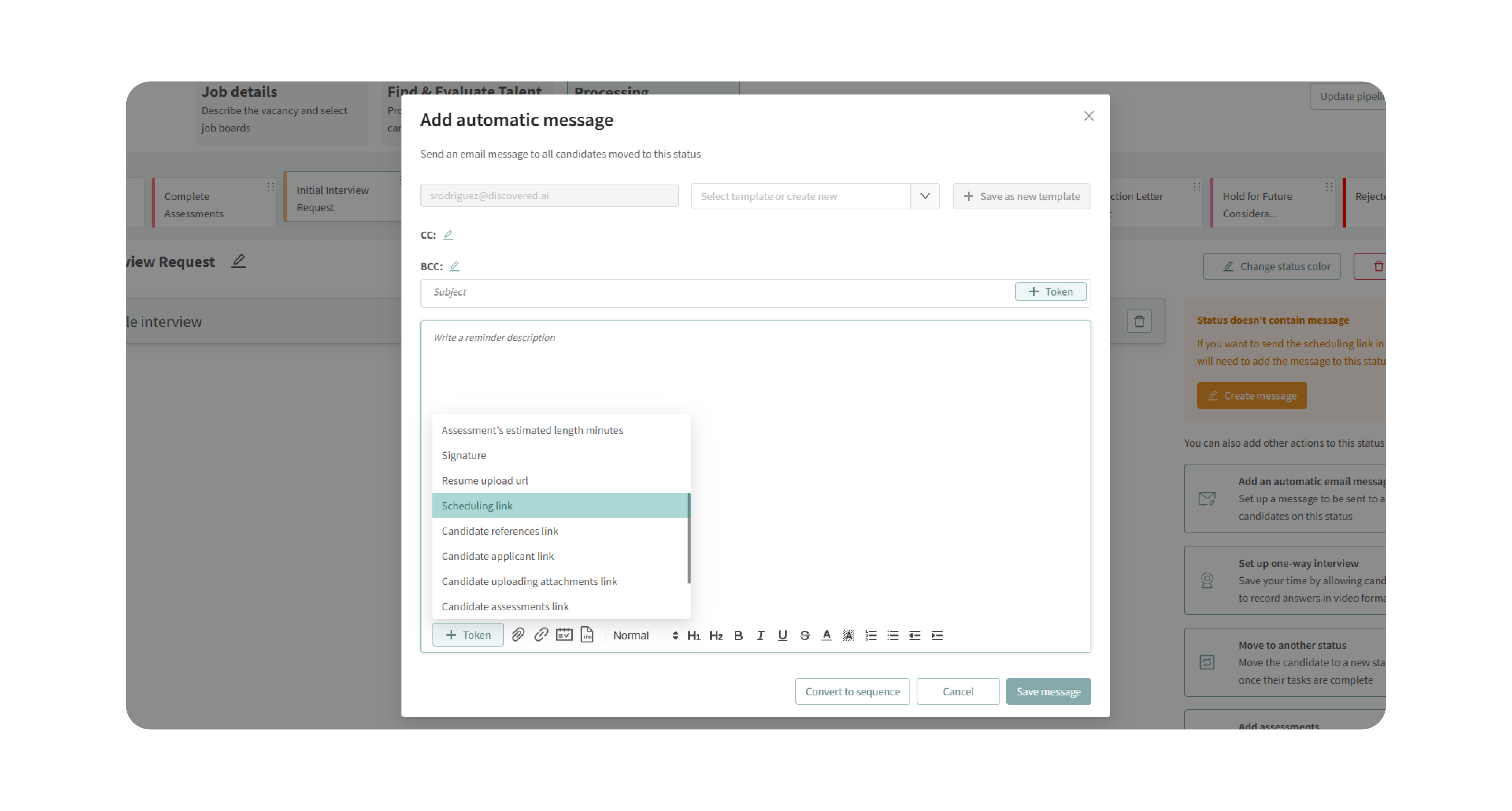 Compose a message to candidates that includes the scheduling link token, so they can select a time directly from your calendar. Save the template for reuse.