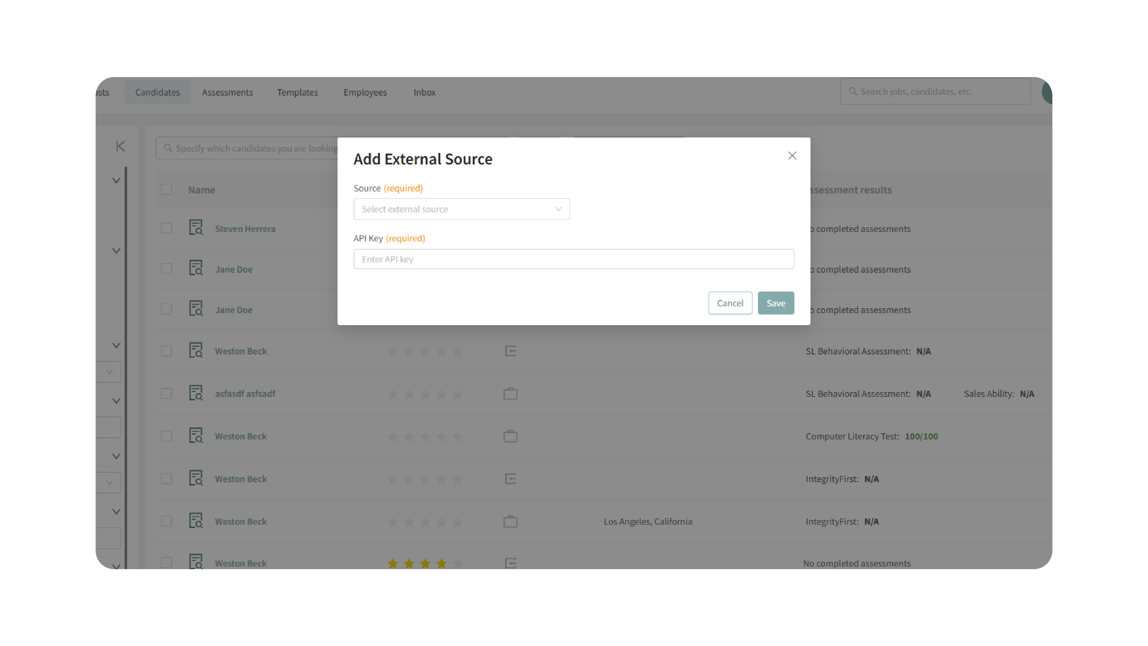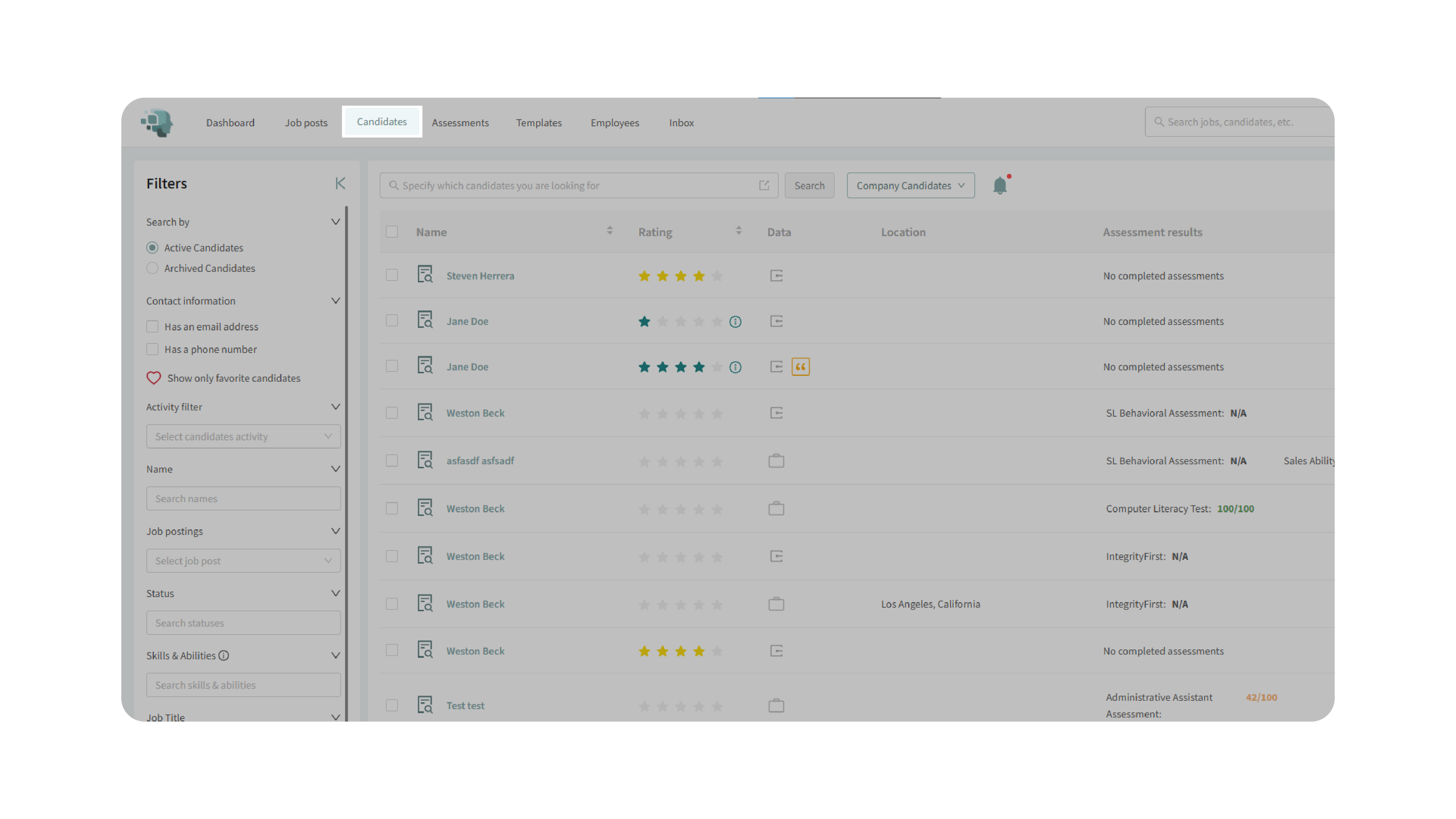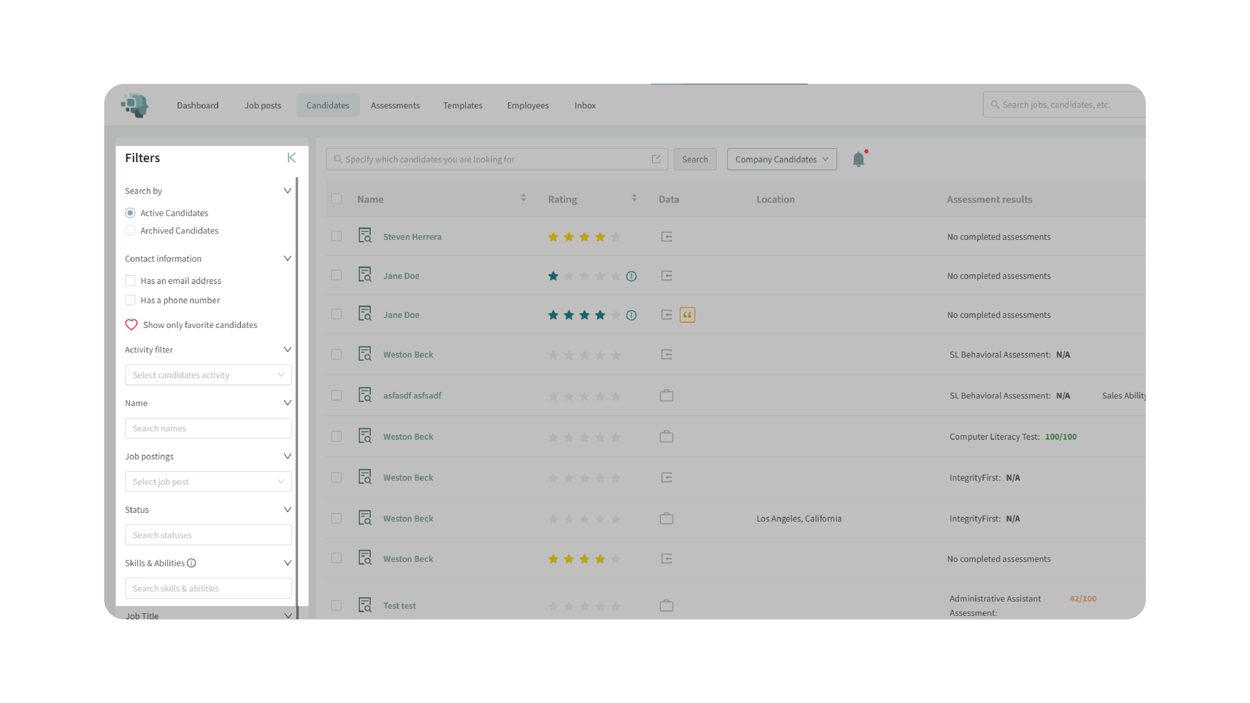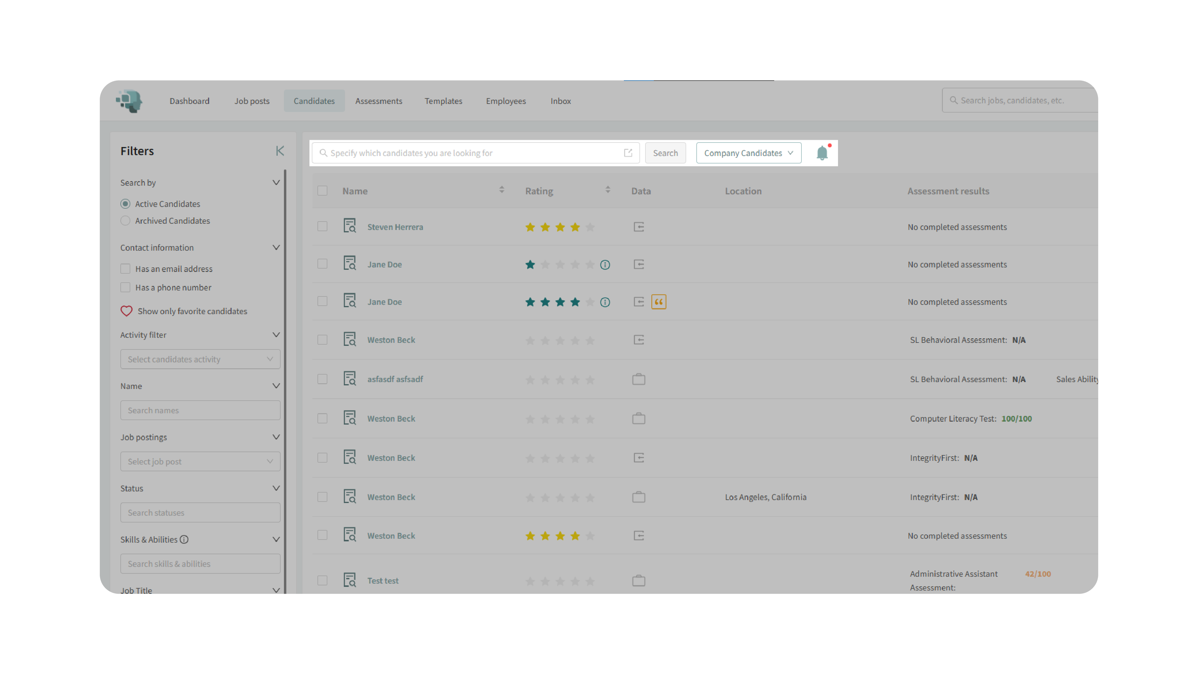 - If you connect an external source (e.g., People Data Labs), additional candidates will appear in the same unified search view as your company’s candidates.