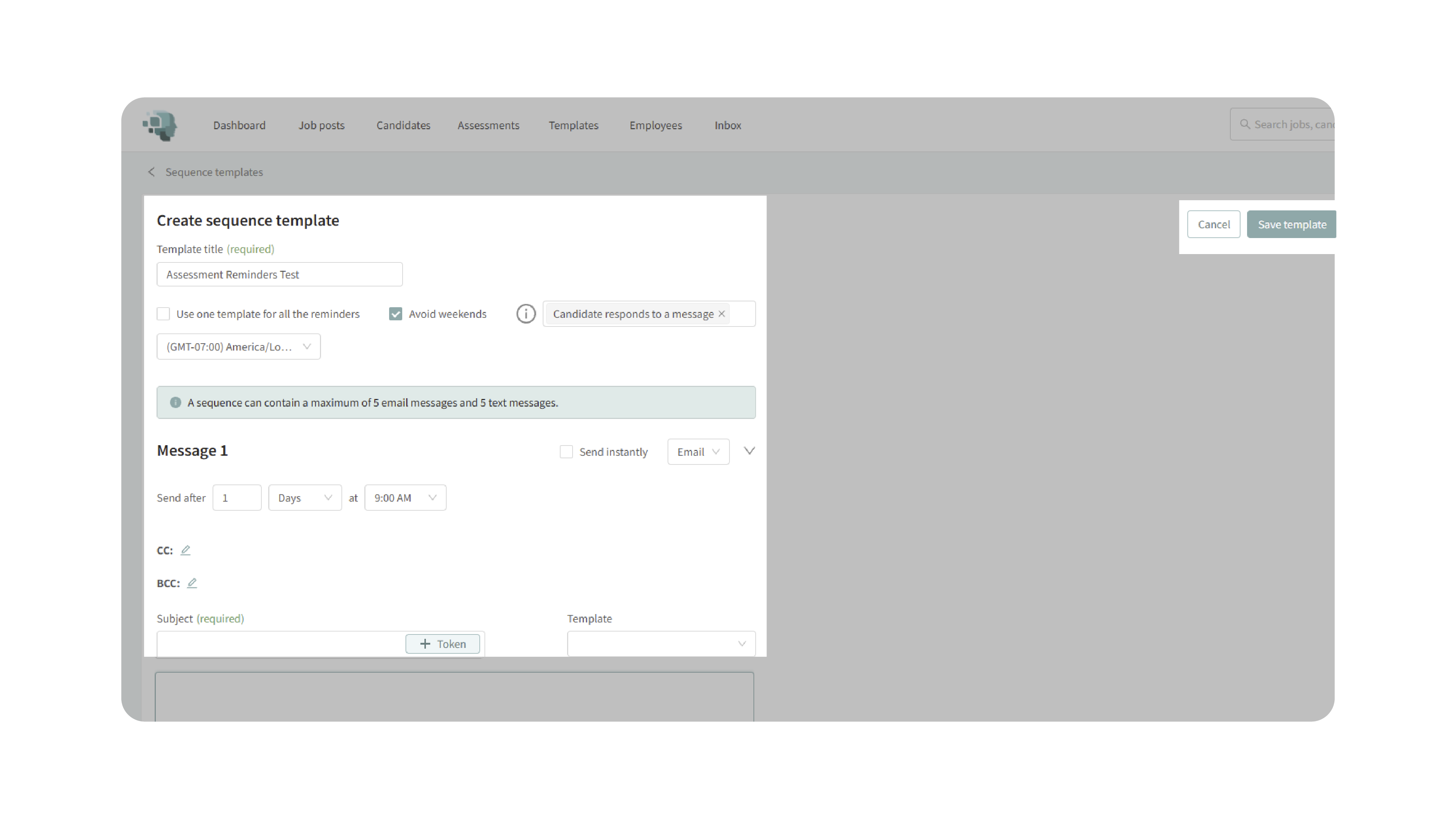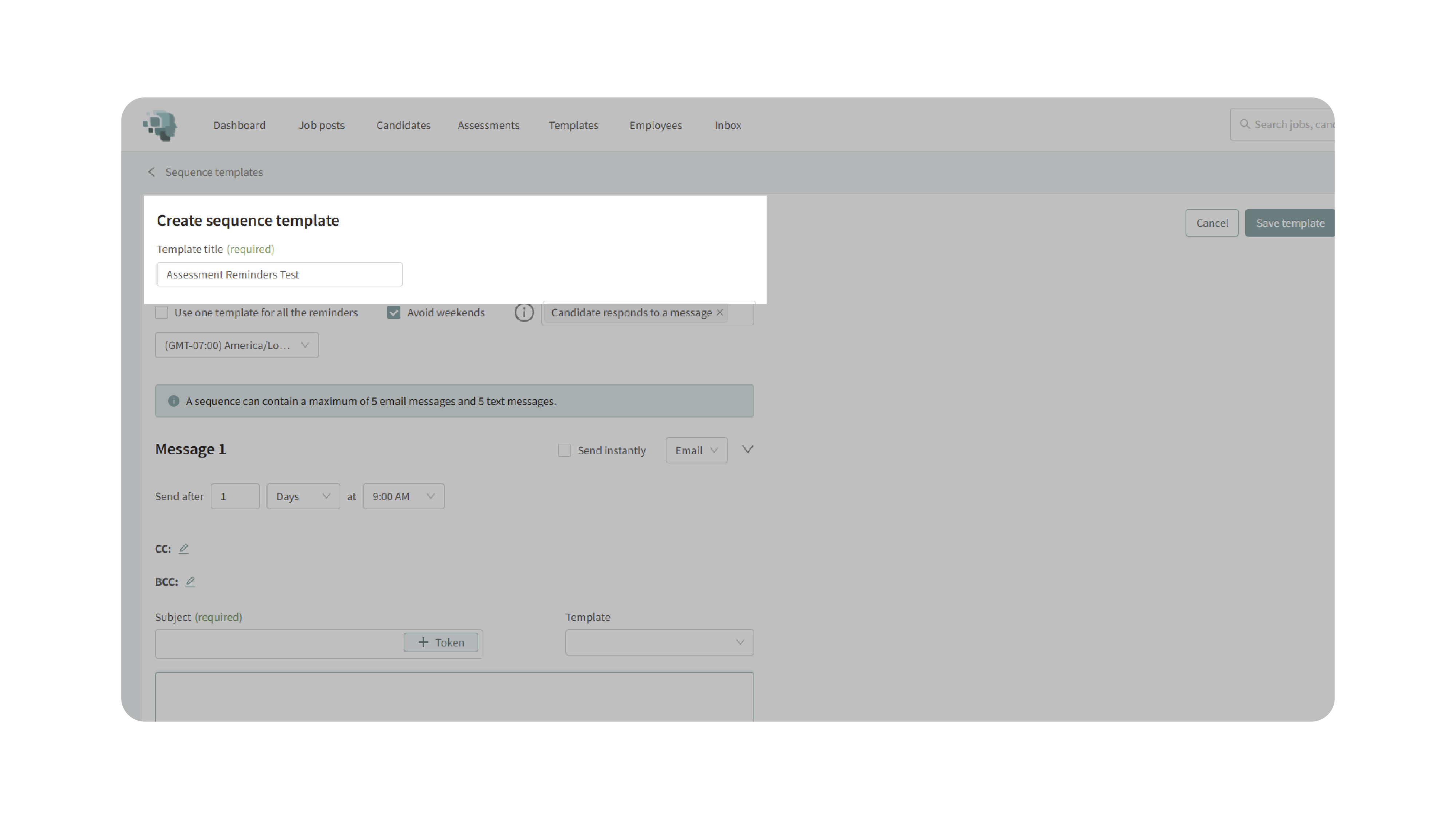 - Enter a title for the template (e.g., Assessment Reminders or Interview Follow-Up Series).