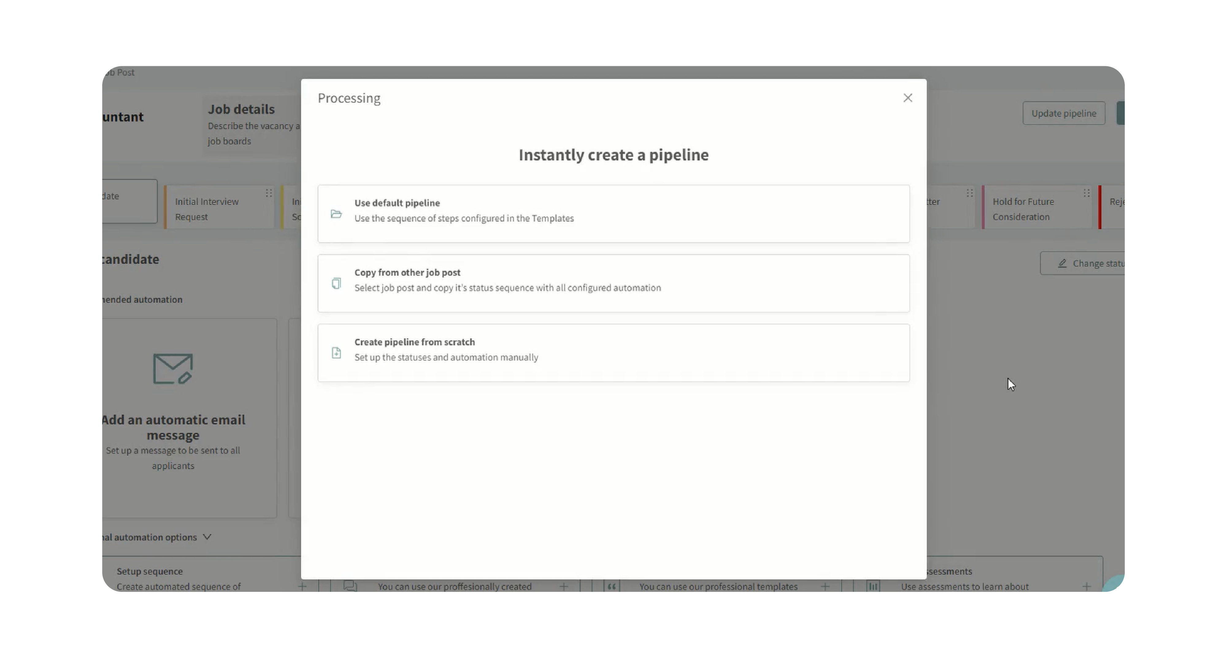 With statuses and default pipelines, you can ensure every job follows a structured, repeatable hiring process while minimizing manual work.