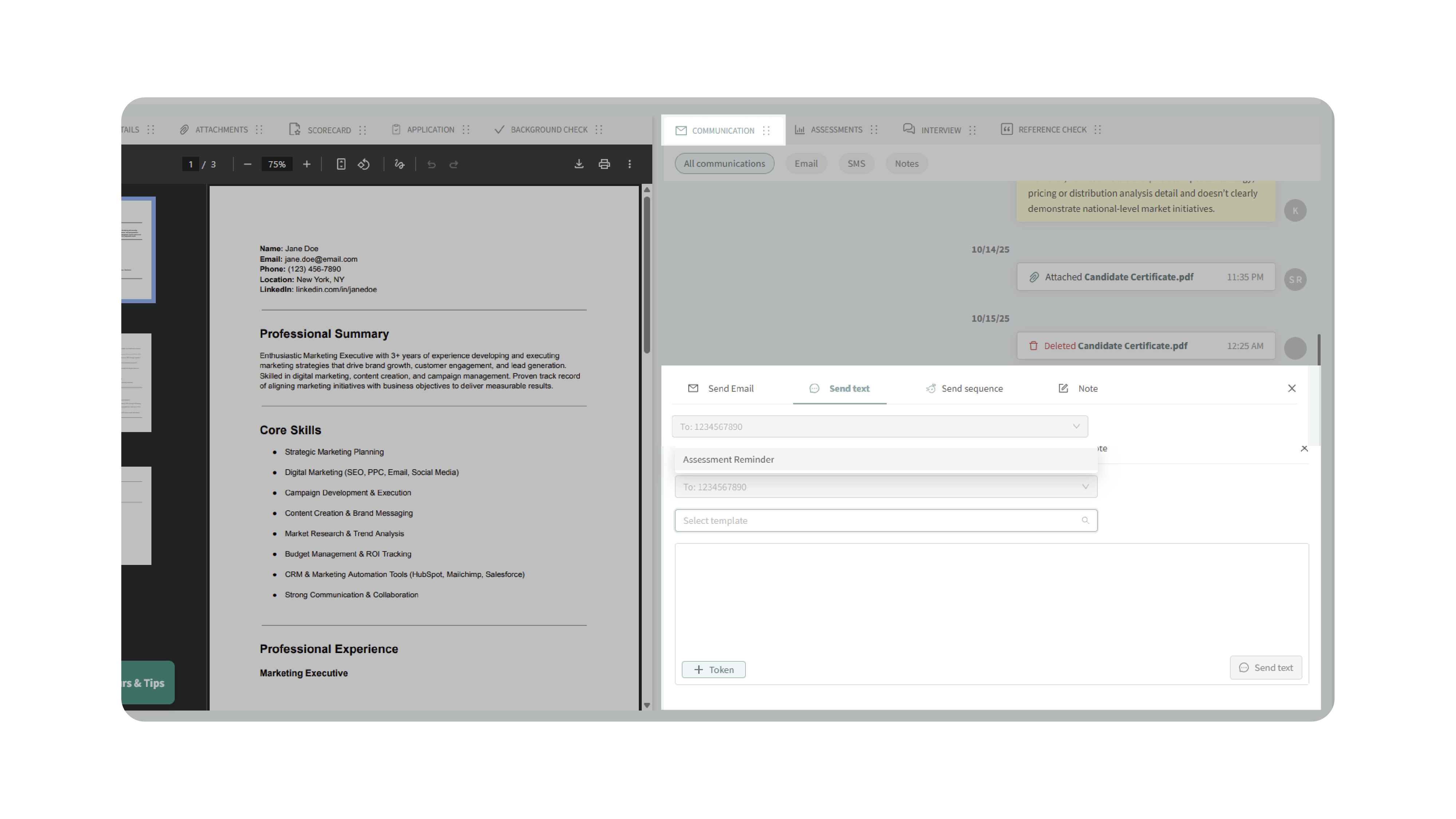 - Sent messages appear in each candidate’s communication log, ensuring transparency.