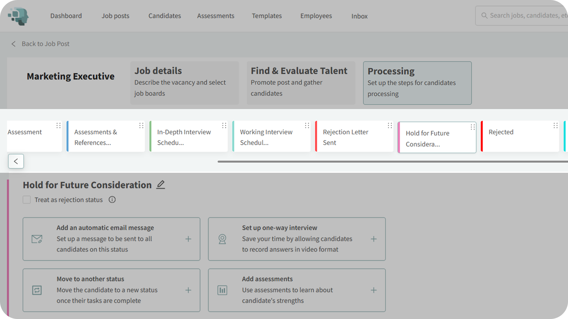 - This is where you manage candidate statuses and pipeline behavior.