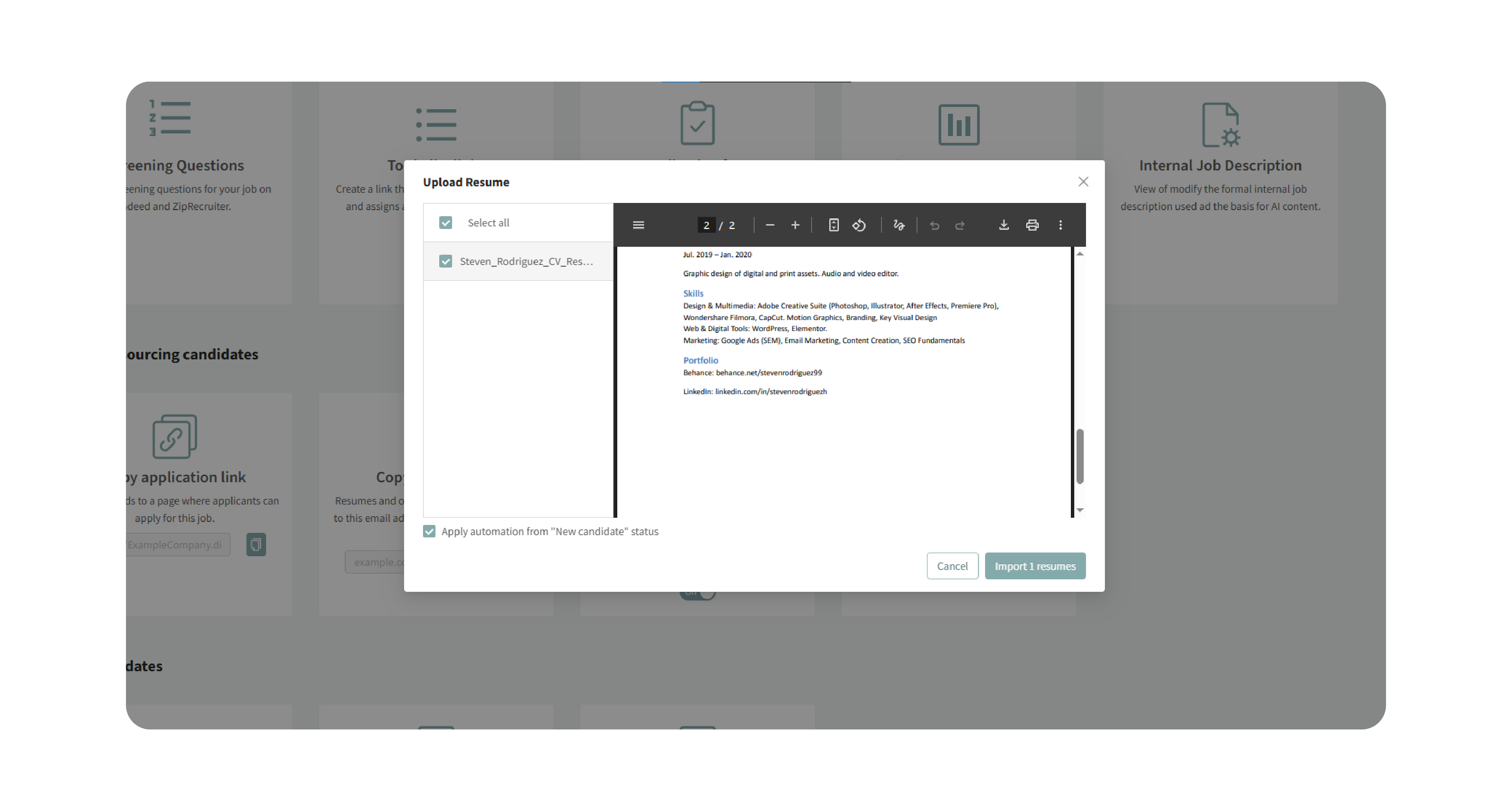 - Click Import Resume to upload the candidate’s resume into the job posting.