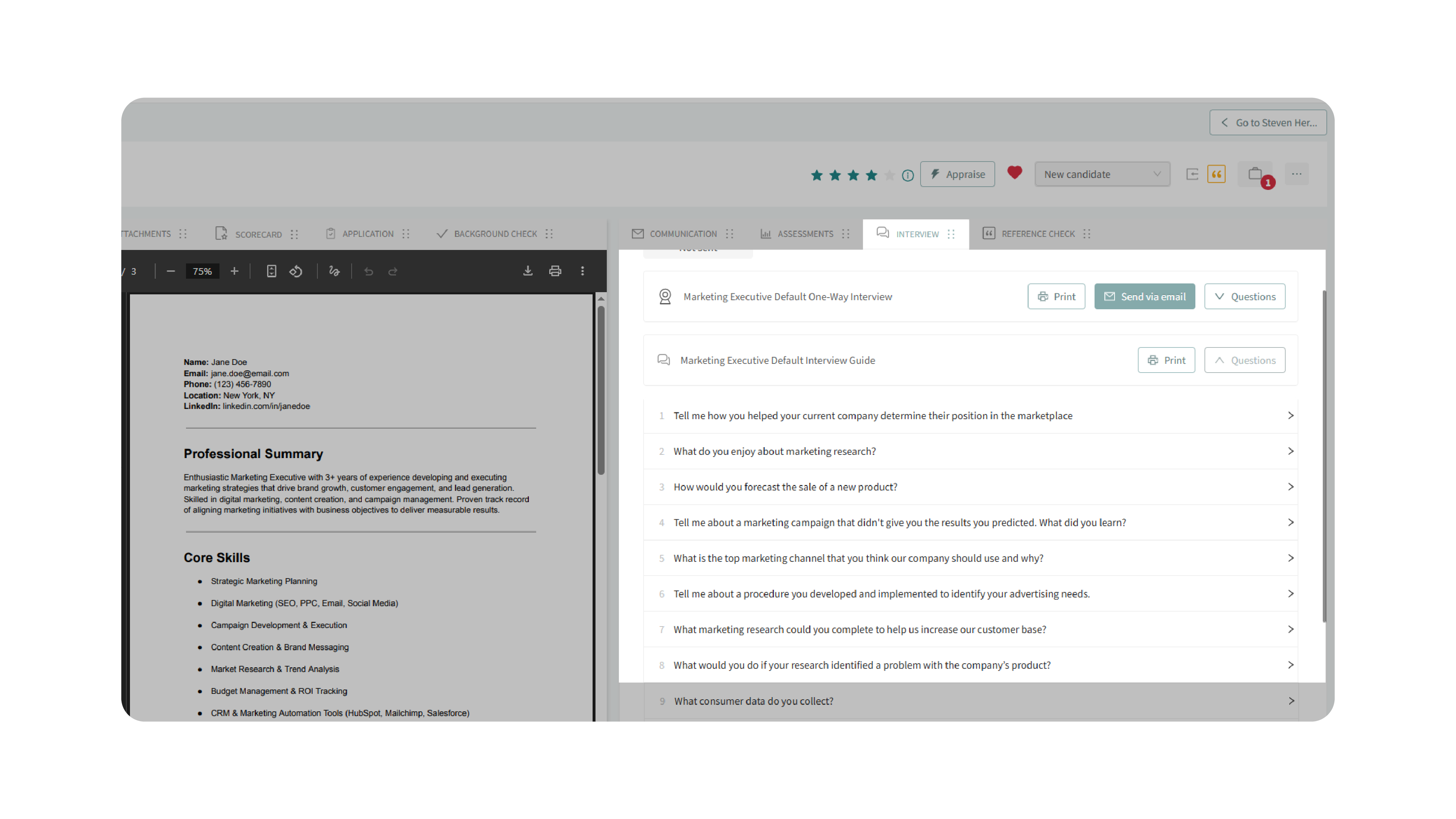 - Access the candidate’s resume, assessments, and scorecards alongside interview questions.
