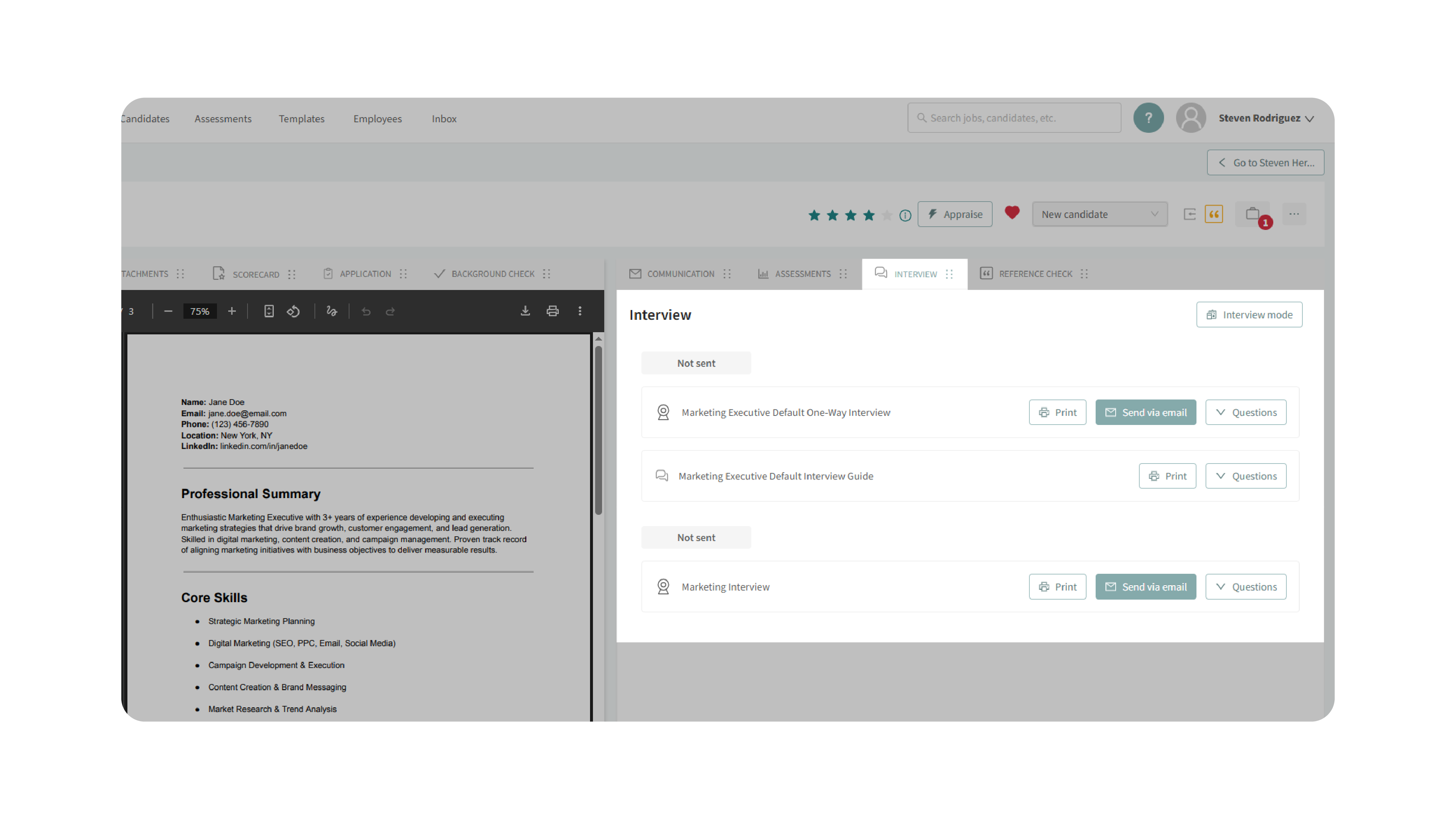 You can play recorded interviews, review transcripts, add comments, and even tag other team members for collaboration. For live interviews, Interview Mode offers a streamlined interface where you can view resumes, assessments, and scorecards, while making real-time notes. You can also print interview questions for offline use—ensuring a smooth process for both virtual and in-person interviews.