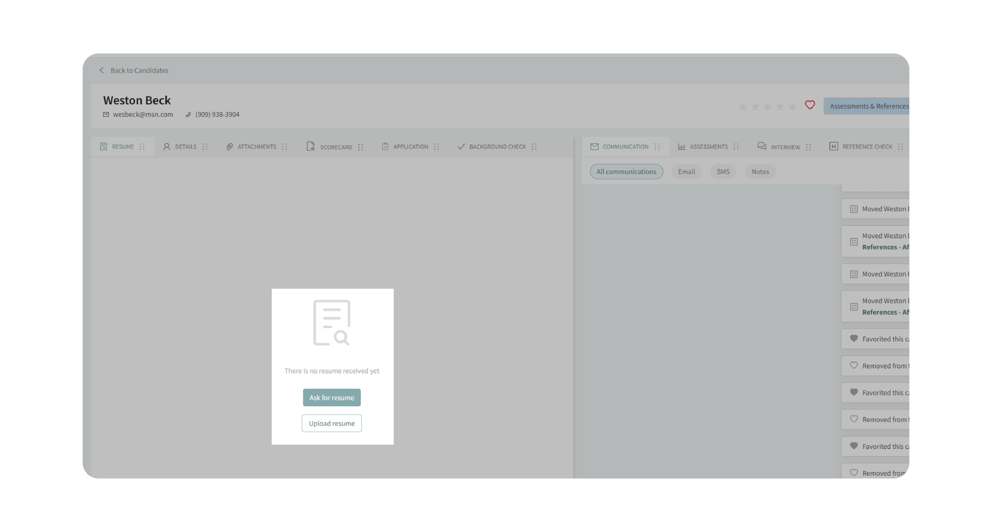 - If a candidate doesn’t have a resume uploaded, click Ask for a resume in their profile.