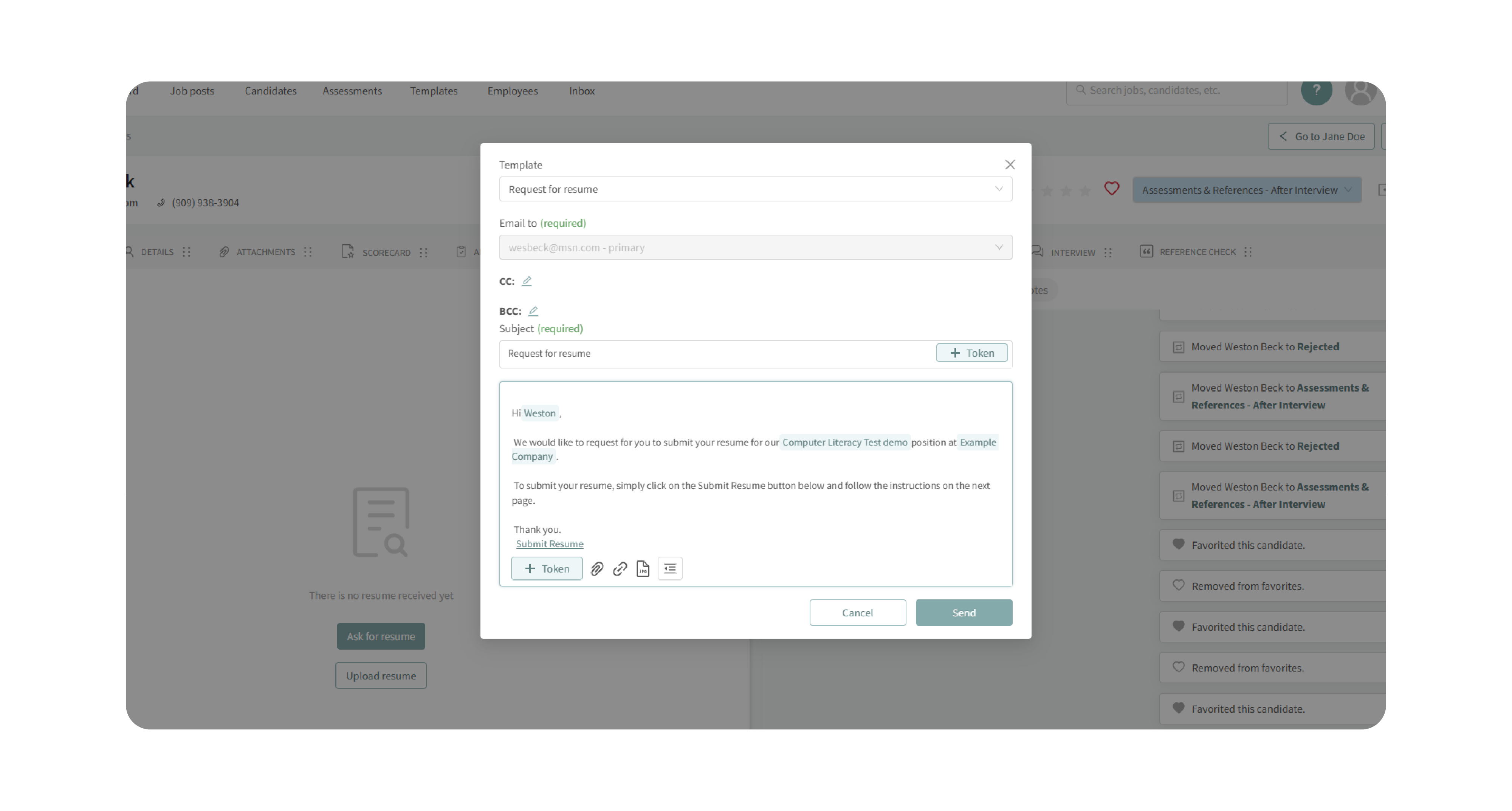 - A pre-written message template appears—customize it as needed but make sure to include the submit resume token, which gives the candidate a link to upload their file.