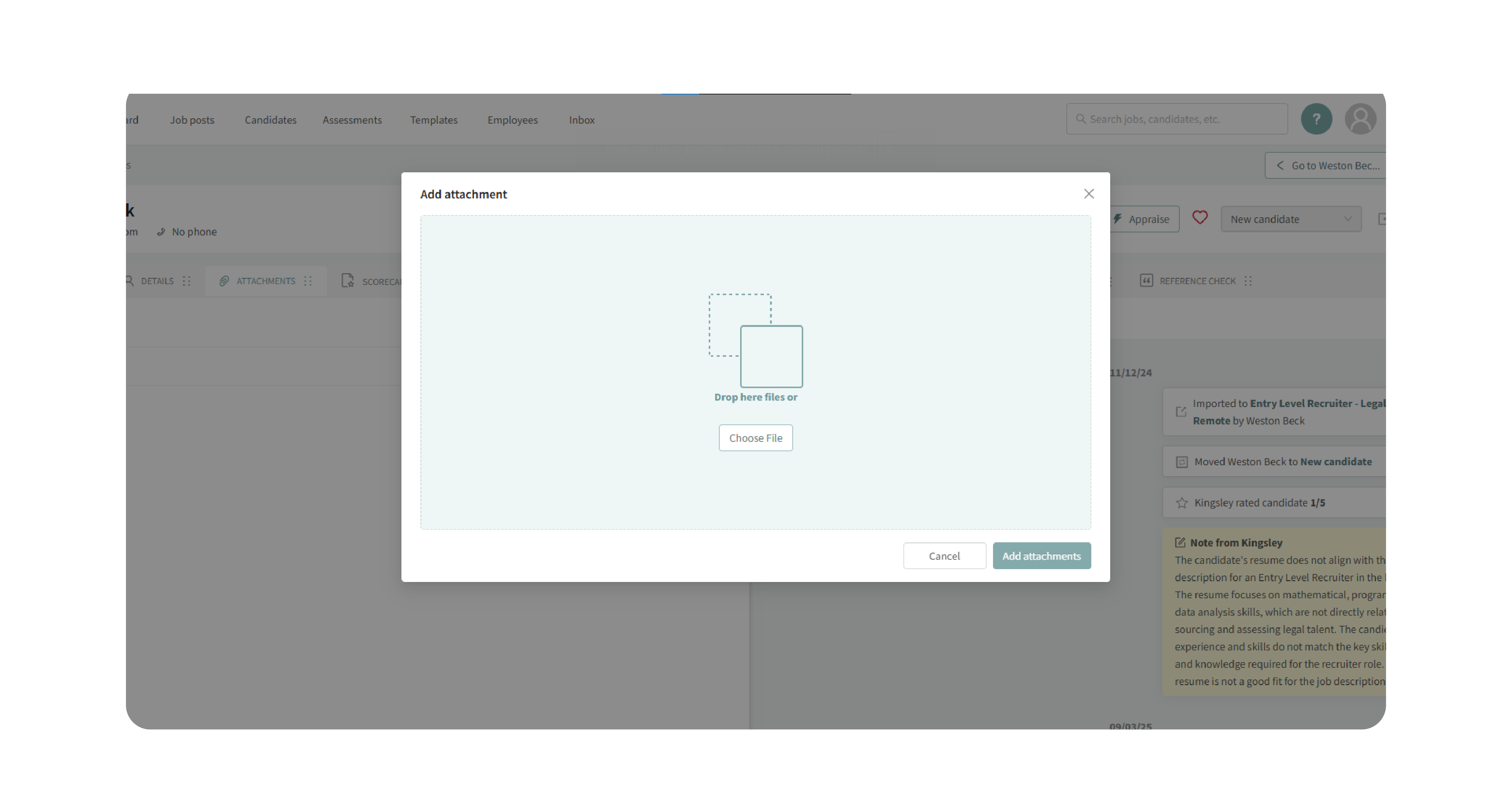 - Click Add attachment in the candidate’s profile and upload the new document.